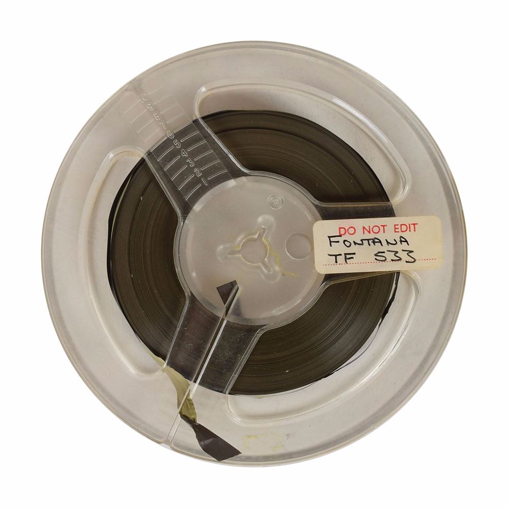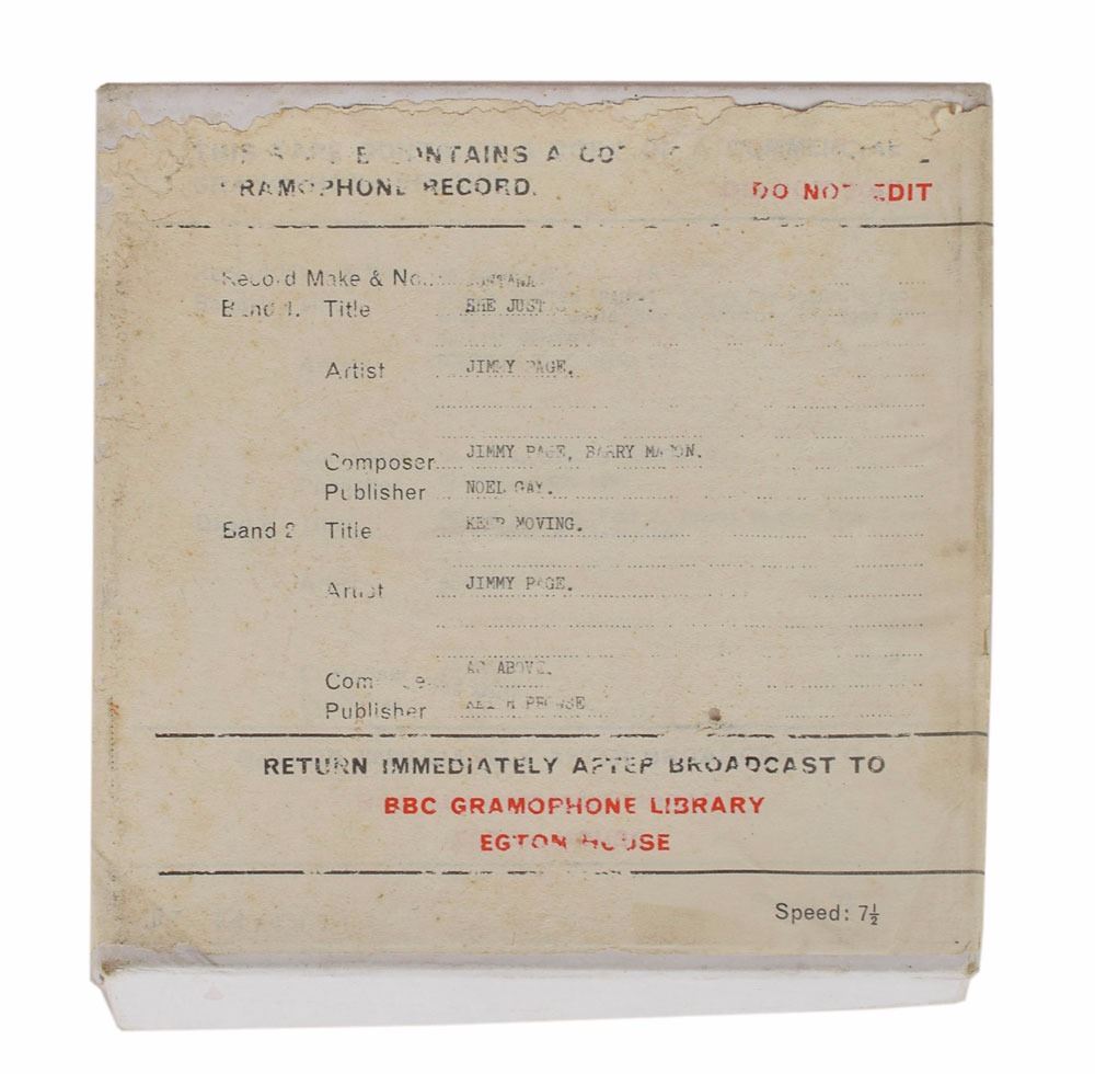 An original reel of BBC Gramophone 1/4-inch audio tape that contains Jimmy Page’s 1965 debut solo single 'She Just Satisfies/Keep Moving,' released on Fontana Records on February 26, 1965. Page plays all instruments on the single apart from drums, and also handles the vocals. Contained in its original box with typed BBC label. In very good to fine condition, with moderate rubbing to label on cover; tape itself remains in overall fine condition. Accompanied by a certificate of authenticity from Tracks. The recordings for 'She Just Satisfies' took place toward the end of Page's prolific career as one of the most sought-after session guitarists on the UK rock scene, but before he stepped into the spotlight as a member of the Yardbirds (and later Led Zeppelin). This was the only single Page released as a solo artist, and the only instance in which he is known to have provided lead vocals.