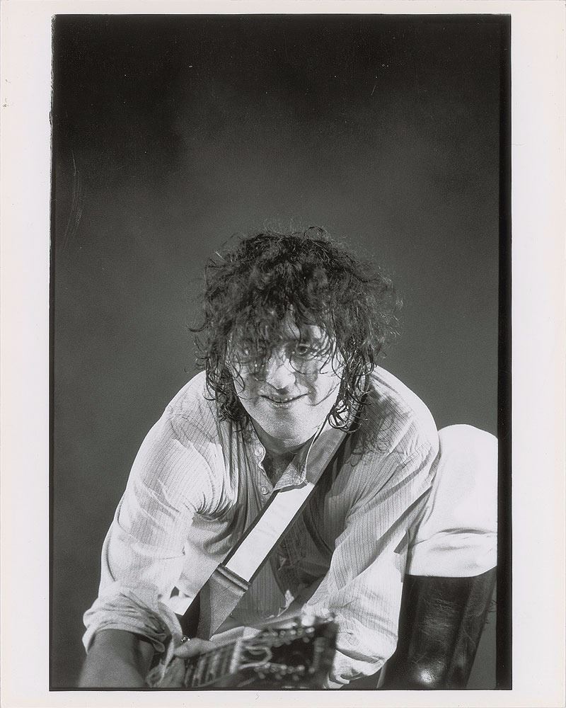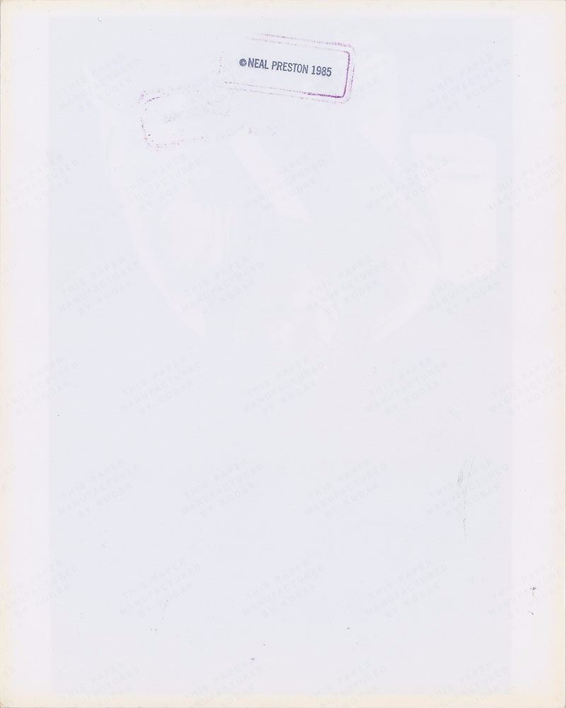 Original glossy 8 x 10 photo of a sweaty Jimmy Page hunched down and playing his guitar during a performance. Reverse a 1985 Neal Preston credit stamp. In fine condition. Preston is a legendary rock photographer best known for his collaborations with Led Zeppelin, Queen, The Who, Bruce Springsteen, Fleetwood Mac, and Michael Jackson. From the Globe Photo archives.