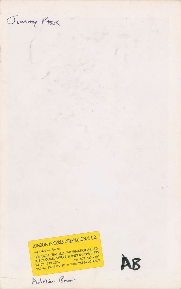 Original glossy 7.5 x 11.75 silver gelatin photo of Jimmy Page in a comfortable seated position. Reverse bears a London Features International label and is annotated with the name of photographer Adrian Boot. In fine condition, with creasing to borders, easily matted out. Boot is one of Britain’s most celebrated music photographers. He was the staff photographer for Melody Maker, and also shot for NME, The Face, The Guardian and The Times (of London). He has photographed a wide variety of musicians, including the Sex Pistols, Clash, Damned, Jimmy Page, Bob Marley & The Wailers, the Grateful Dead in Egypt, and Live Aid. From the Globe Photo archives.