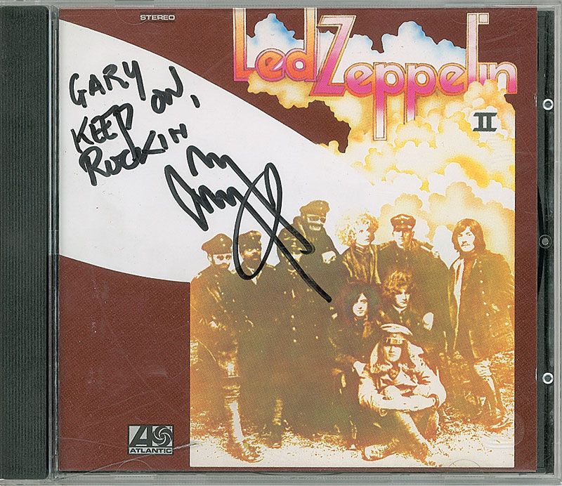 Led Zeppelin II CD signed and inscribed on the front cover of the booklet, “Gary, Keep on rockin’ Jimmy Page.” In fine condition. The CD is included. Accompanied by a certificate of authenticity from Tracks.