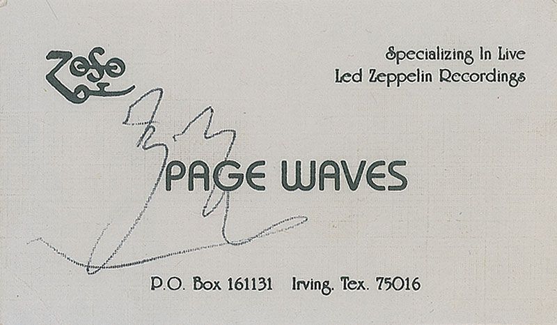 Business card for Page Waves, 3.25 x 2, in Irving, Texas, “specializing in live Led Zeppelin recordings,” signed on the front in black ballpoint by Page. Reverse bears an unknown signature and sentiment. In fine condition.