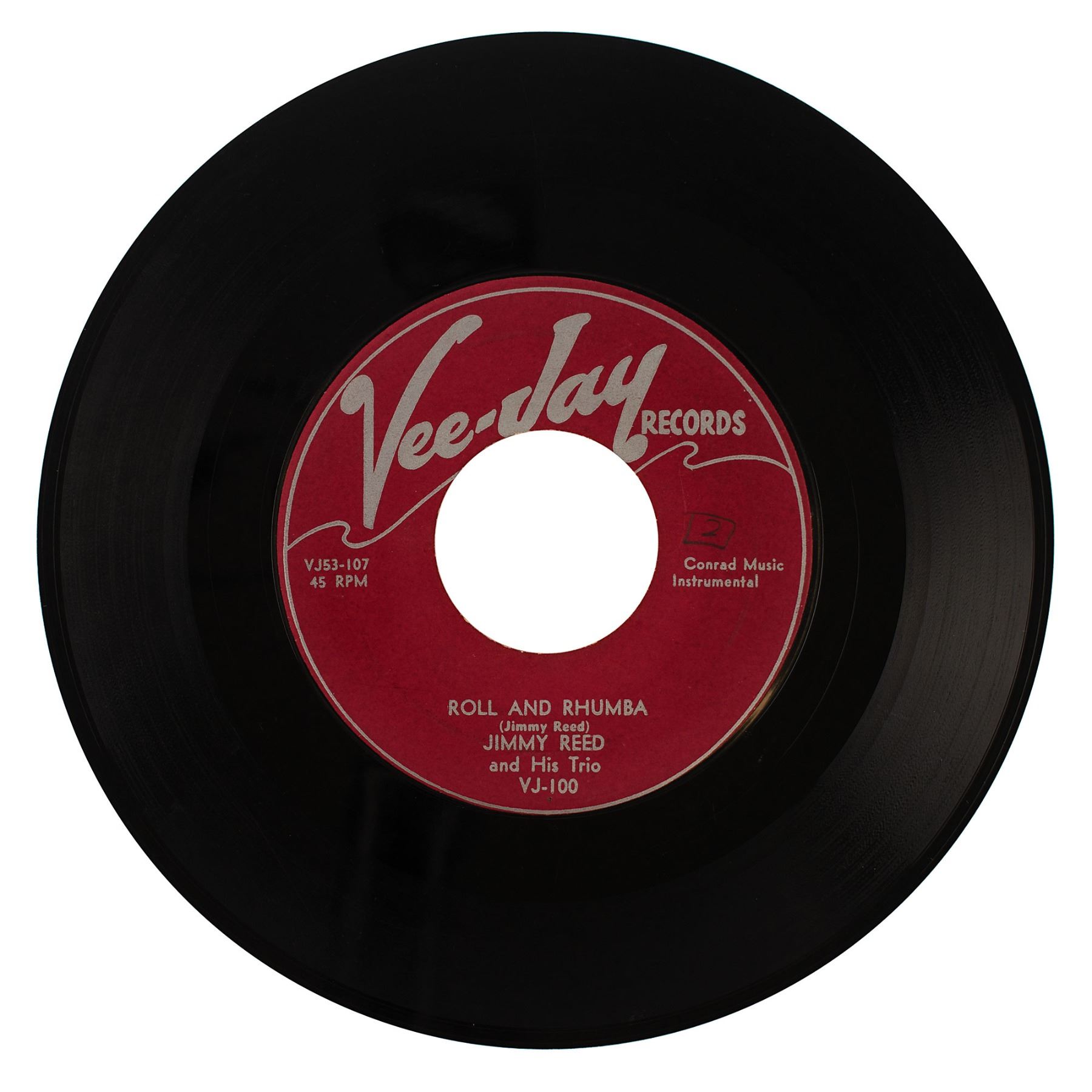 Rare Vee-Jay Records 45 RPM single of 'High and Lonesome / Roll and Rhumba' by Jimmy Reed, released in 1953 (VJ53-104/VJ53-107). Condition (Cover/LP Record): Generic/VG++, with small pencil notations to labels.