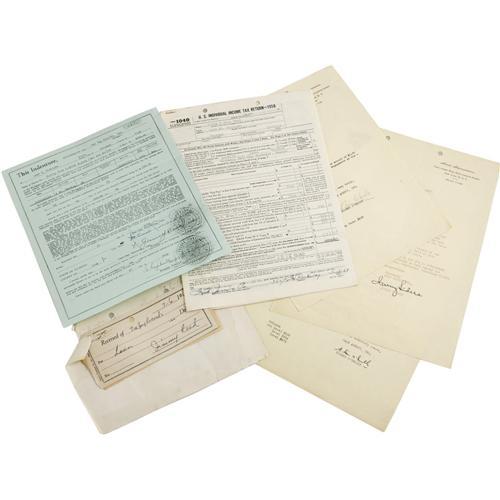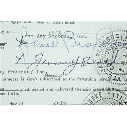 <B>Jimmy Reed Mini-Archive.</B></I> Included is mortgage dated July 27, 1961, and signed by Reed in black ink (Excellent condition with light wear and fold creases); five receipts dating from July 7, 1952 to July 6, 1954, each signed by Reed in black ink (Fine with mild wear and moderate tanning and fading); a Form 1040 Income Tax Return, dated May 12, 1959, prepared for Jimmy and Mary Reed (Very Fine with mild wear); and three Gale Agency letters regarding Reed, dated from September 9 to October 29, 1957 (Excellent with mild wear and light fold creases). <I>Accompanied by LOA from PSA/DNA.</B></I> <BR><BR><B>Important no