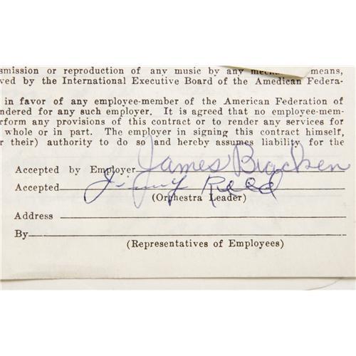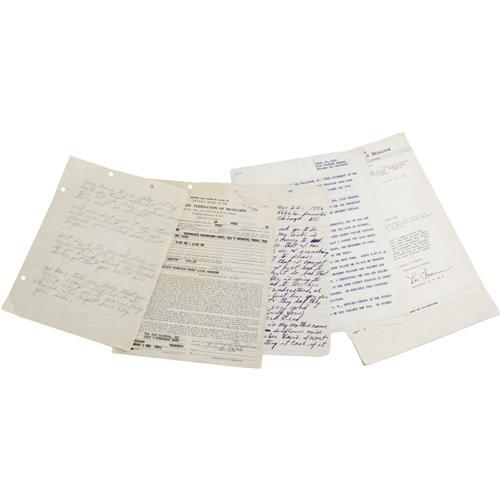 <B>Jimmy Reed Mini-Archive.</B></I> Includes a handwritten letter from Reed's wife in blue ink on notebook paper, dated March 25, 1956; a sheet of notebook paper with handwritten lyrics in pencil; an American Federation of Musicians contract dated July 18, 1955, signed by Reed in blue ink; a mimeographed copy of a police statement given by Reed regarding the theft of his 1957 Mercury Turnpike sedan, dated April 23, 1958; and a breach of contract complaint filed against Reed by Palms of Hallendale, Inc. dated October 17, 1957. The items are in overall Very Fine condition with mild to moderate wear. <I>Accompanied by LOA from PSA/DNA.</B></I> <BR><BR><B>Important no