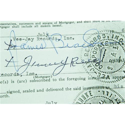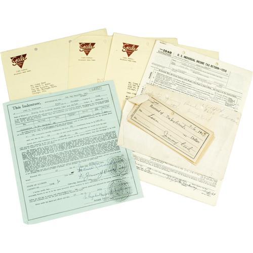 <B>Jimmy Reed Mini-Archive.</B></I> Included is mortgage dated July 27, 1961, and signed by Reed in black ink (Excellent condition with light wear and fold creases); five receipts dating from July 7, 1952 to July 6, 1954, the latter signed by Reed in black ink (Fine with mild wear and moderate tanning and fading); a Form 1040 Income Tax Return, dated May 12, 1959, prepared for Jimmy and Mary Reed (Very Fine with mild wear); and three Gale Agency letters regarding Reed, dated from September 9 to October 29, 1957 (Excellent with mild wear and light fold creases). <I>Accompanied by LOA from PSA/DNA.</B></I><BR><BR><b>Shipping:</b> Small Flat (<a target="_blank" href="http://www.heritageauctions.com/common/shipping.php">view shipping information</a>) <BR><BR><B>Important not
