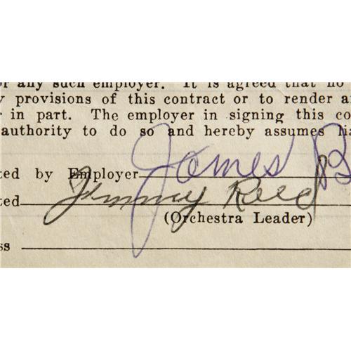 <B>Jimmy Reed Signed Documents.</B></I> Set of documents includes an American Federation of Musicians contract dated January 18, 1955, signed by Reed in black ink; an AFM contract dated October 1, 1956, signed by him in blue ink; and carbons for AFM contracts dated April 11, 1962, and July 10 and October 14, 1963, each with Reed's signature; plus a Universal Recording Corp. studio log sheet with notes on four Reed tracks; and a bank receipt book belonging to Reed. Items are in overall very Fine condition with mild wear. <I>Accompanied by LOA from PSA/DNA.</B></I> <BR><BR><B>Important notice