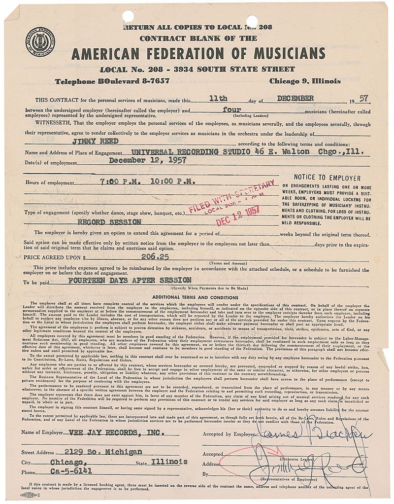 Blues musician and songwriter (1925–1976) who brought his distinctive musical style to mainstream audiences. DS, one page both sides, 8.5 x 11, December 11, 1957. American Federation of Musicians agreement for Reed to play for three hours at the Universal Recording Studio for a price of $206.25, to be paid 14 days after the session. Signed at the bottom in blue ballpoint by Reed. In very good condition, with punch holes to top, office stamp to body, red pencil notation next to signature, a uniform shade of toning, and a small tear to right edge.