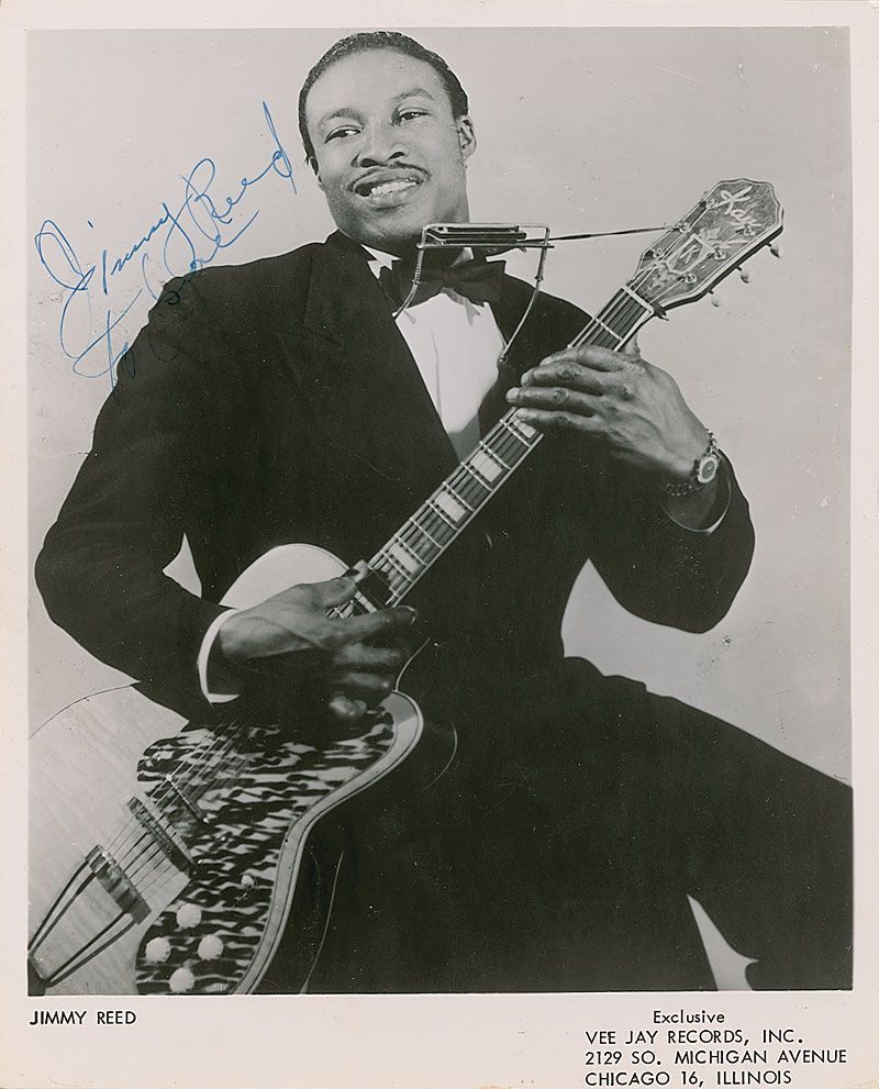 American blues musician and songwriter, notable for bringing his distinctive style of blues to mainstream audiences (1925–1976). Vintage glossy 8 x 10 publicity photo of Reed posing with his Kay guitar, signed and inscribed in fountain pen, “Jimmy Reed, To Joe.” In fine condition, with light scattered surface creases and impressions. Reed is exceptionally rare in signed photos—this is the first we have ever offered.
