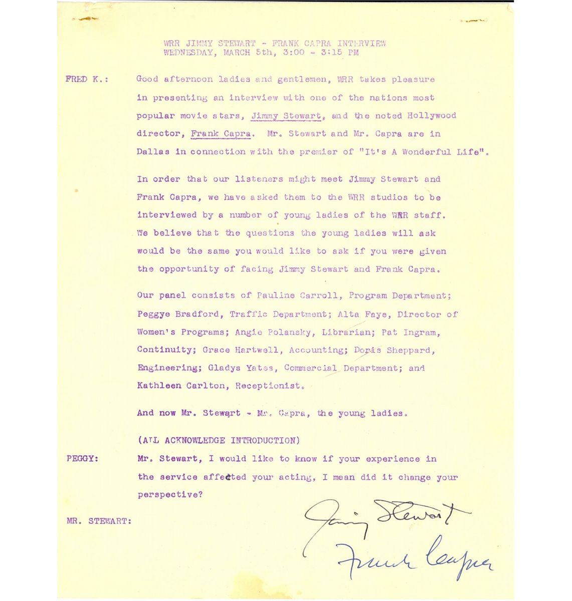 Typed script of an interview with Jimmy Stewart and Frank Capra regarding It's A Wonderful Life signed on the first page by Stewart in black ink and Capra in blue ink. The interview took place at radio station WRR in Dallas, Texas in 1946. The 3 1/2 pages include an introduction to the radio audience, telling them that Stewart and Capra were in Dallas "with the premier of 'It's A Wonderful Life'" and the questions which were asked by women on the staff of WRR. Pages are stapled at the top and show age wear; signatures are very bold.