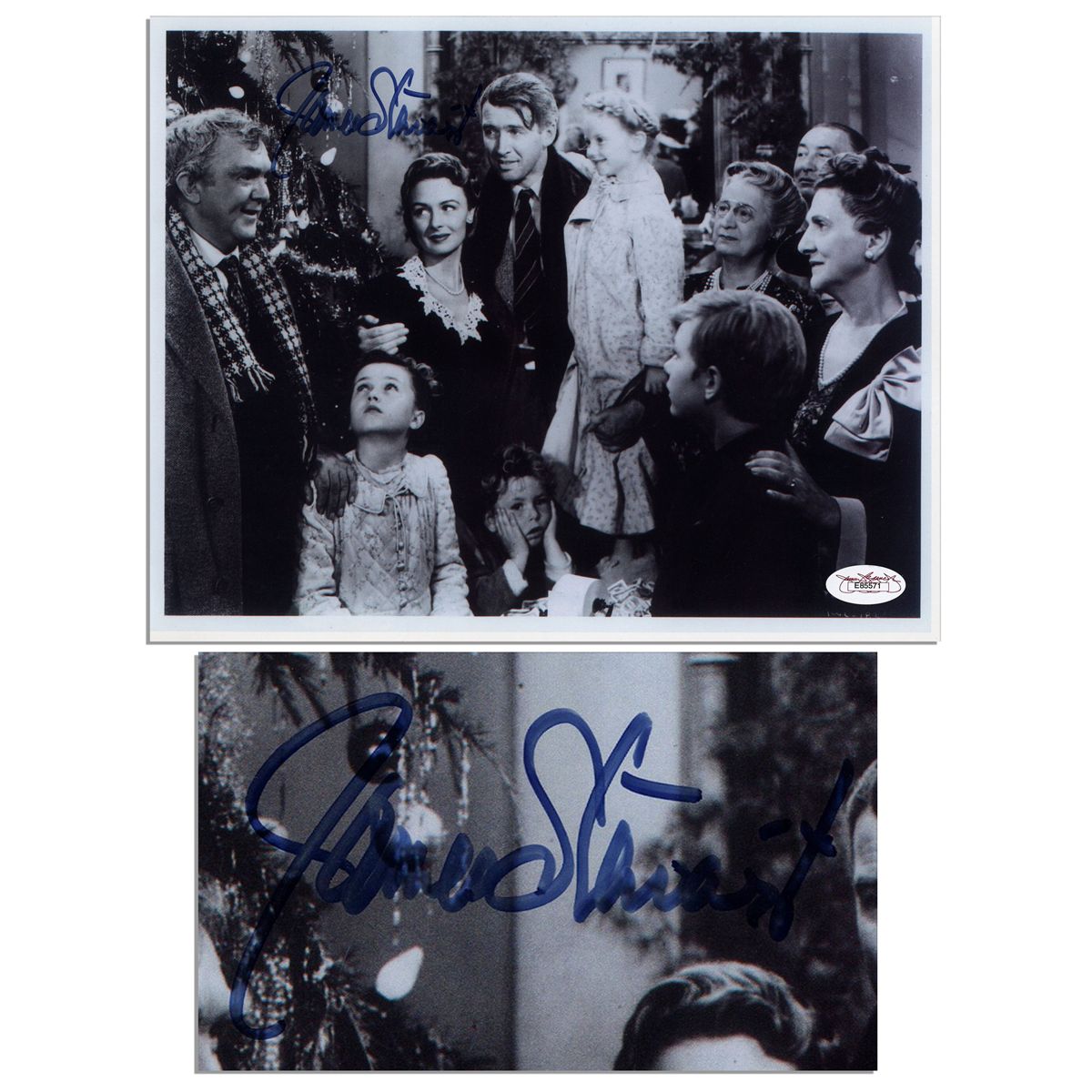 Publicity image from ''It's a Wonderful Life'', signed ''James Stewart'' to the upper left. Black and white photo shows Stewart as George Bailey with Donna Reed by his side as Mary Bailey. Semi-matte photo measures 10'' x 8''. Fine. With JSA COA.