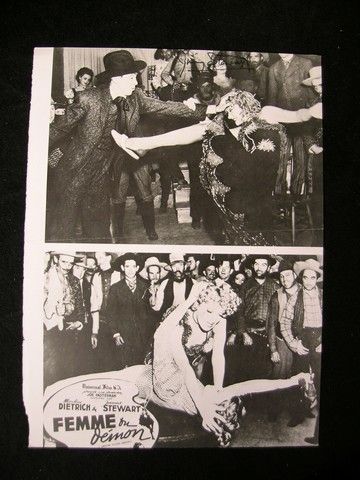 One of the most beloved actors of all time, this is a Jimmy Stewart autographed promotional clipping from the French version of the 1939 film "Destry Rides Again,' also starring Marlene Dietrich. The photo features two scenes from the film, with Jimmy Stewart signing the top portion of the photo in black ink. (measures approx. 8"x 10")