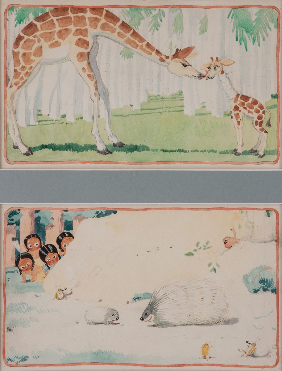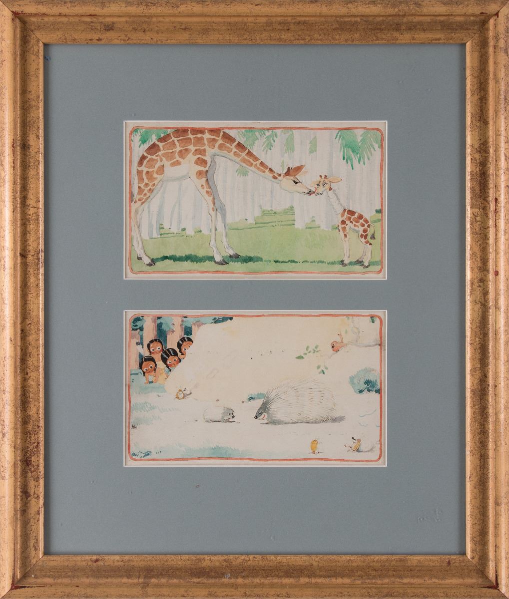 Jimmy Swinnerton (1875-1974). Two works framed together: Near-to-Nature Babies. Each 5 ½" x 9 ¼" mixed media. Verso: Titled, "Ran in the Good Housekeeping Magazine Monthly from 1927-1930."