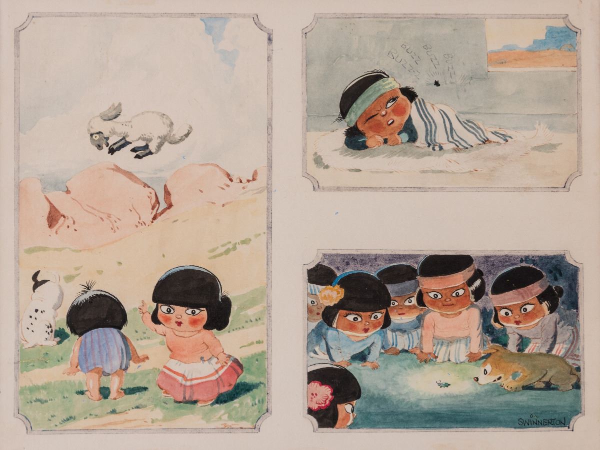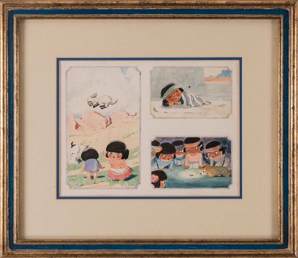 Jimmy Swinnerton (1875-1974). 7" x 9 ½" overall, with three different scenes. Mixed media from the "Kiddies From the Canyon Country" Series. Signed lower left in bottom right scene.