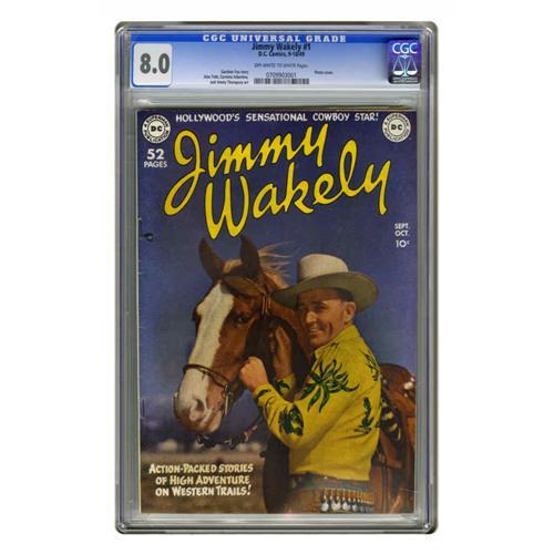 <B>Jimmy Wakely #1 (DC, 1949) CGC VF 8.0 Off-white to white pages.</B></I> This issue's title character benefited from Alex Toth art, while backup feature "Kit Colby, Girl Sheriff" has the work of Carmine Infantino. Overstreet 2005 VF 8.0 value = $700. CGC census 10/05:1 in 8.0, 1 higher.