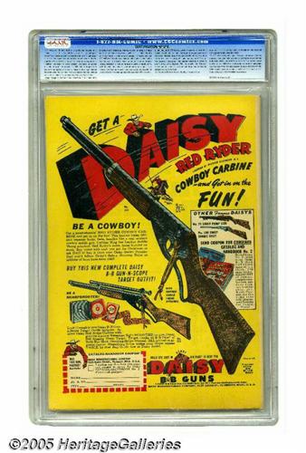 <B>Jimmy Wakely #4 (DC, 1950) CGC NM- 9.2 White pages.</B></I> Those misguided souls who just look at catalog pictures and don't read the text have no idea that this nondescript-looking Western comic has art by Frank Frazetta, Harvey Kurtzman, <I>and</B></I> Alex Toth! As for conscientious types like you, we'll reward you further for reading this far by noting that this is one of only two copies CGC has certified to date, the other being a Fair(-ly pathetic) 1.0. Overstreet 2005 NM- 9.2 value = $600. CGC census 3/05: 1 in 9.2, none higher.