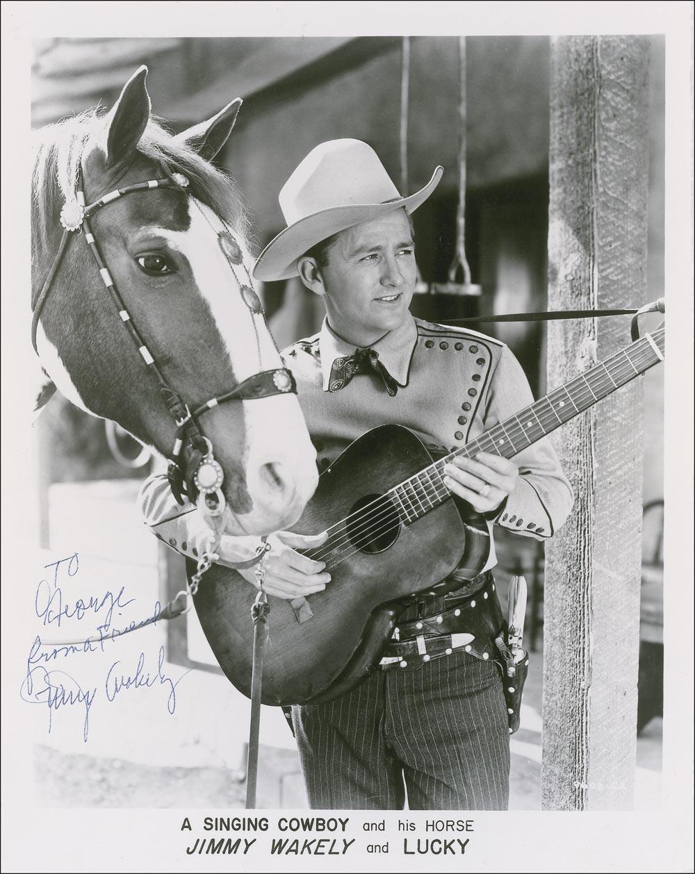Glossy 8 x 10 publicity photo of Wakely and his horse Lucky, signed and inscribed in blue ballpoint “To George from a friend, Jimmy Wakely.” In fine condition.