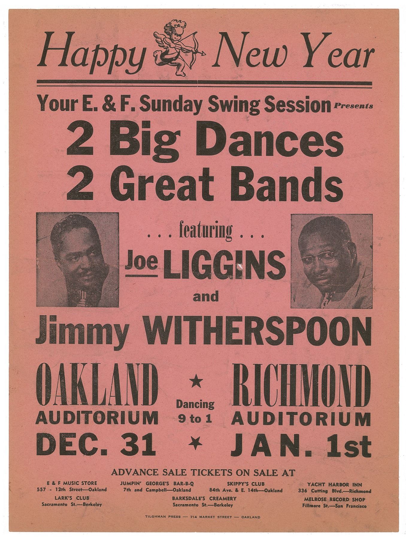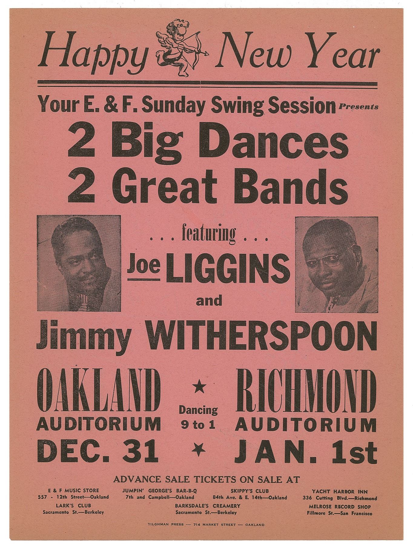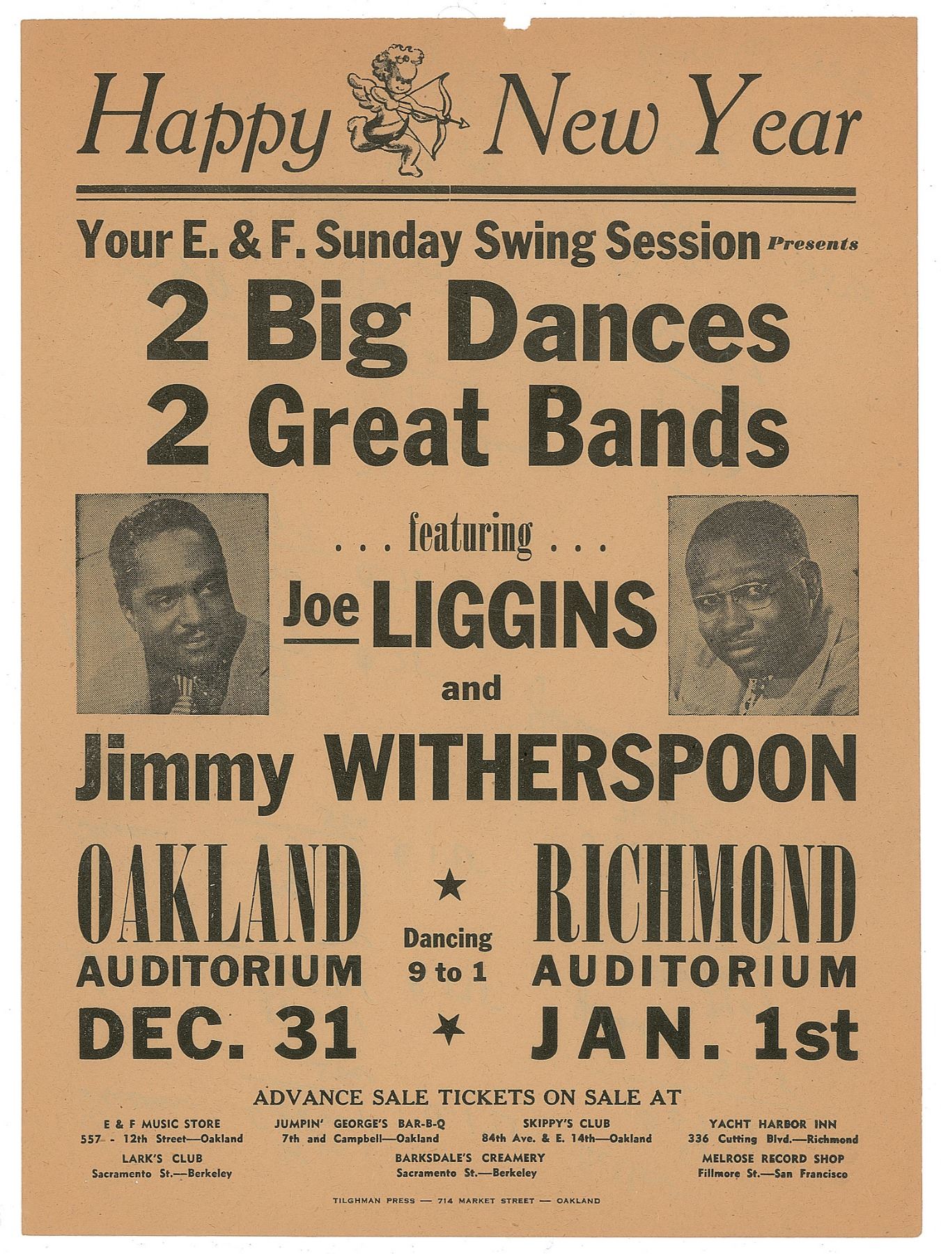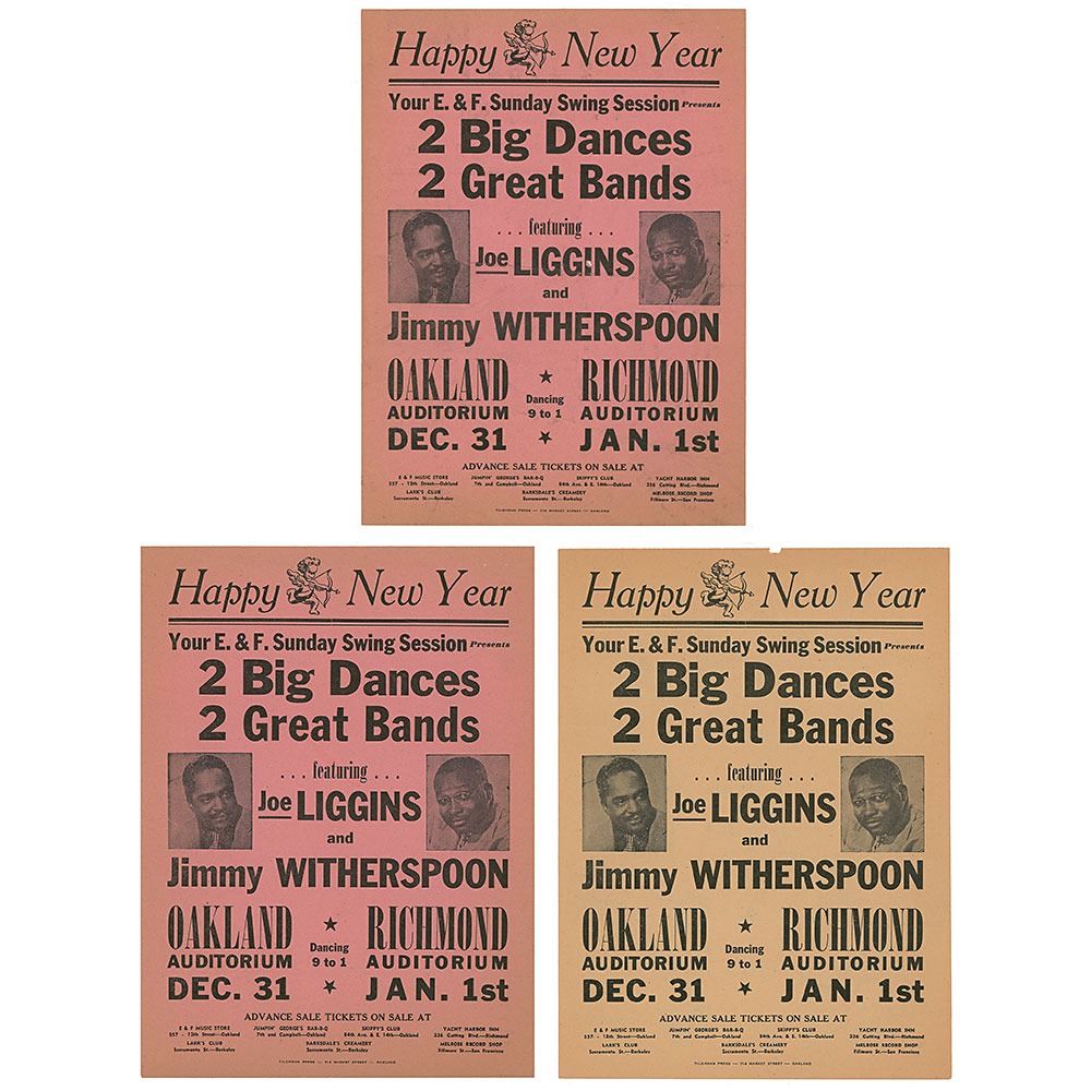 Trio of original 8.75 x 11.75 handbills promoting a pair of Jimmy Witherspoon and Joe Liggins concerts at the Oakland Auditorium and Richmond Auditorium on December 31st and January 1st [no year, but circa early 1950s], with artist images and bold text reading: "Happy New Year, Your E. & F. Sunday Swing Session presents 2 Big Dances, 2 Great Bands, featuring Joe Liggins and Jimmy Witherspoon." In overall very good to fine condition.