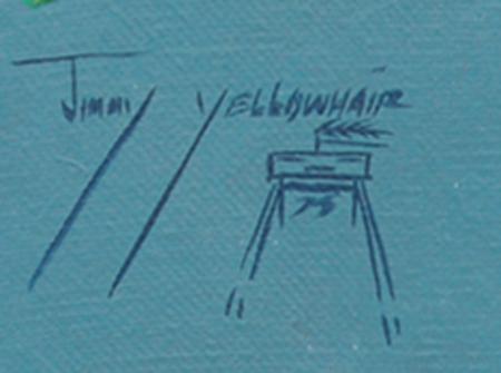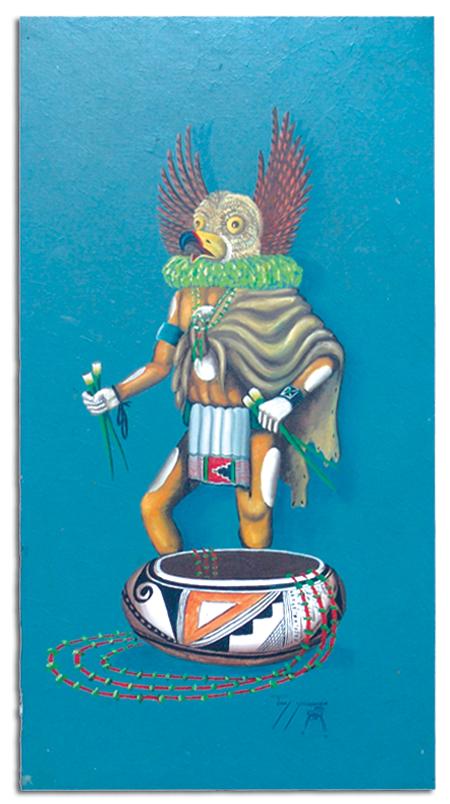 Signed original acrylic on canvas, a still life with necklace, acoma bowl, and katsina doll. Condition: very good. 30" x 15"