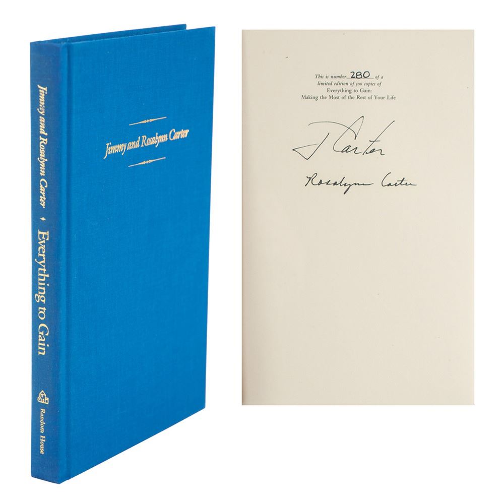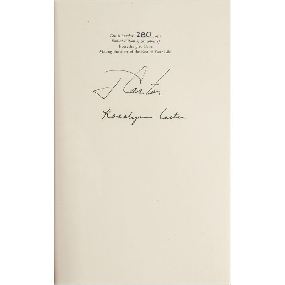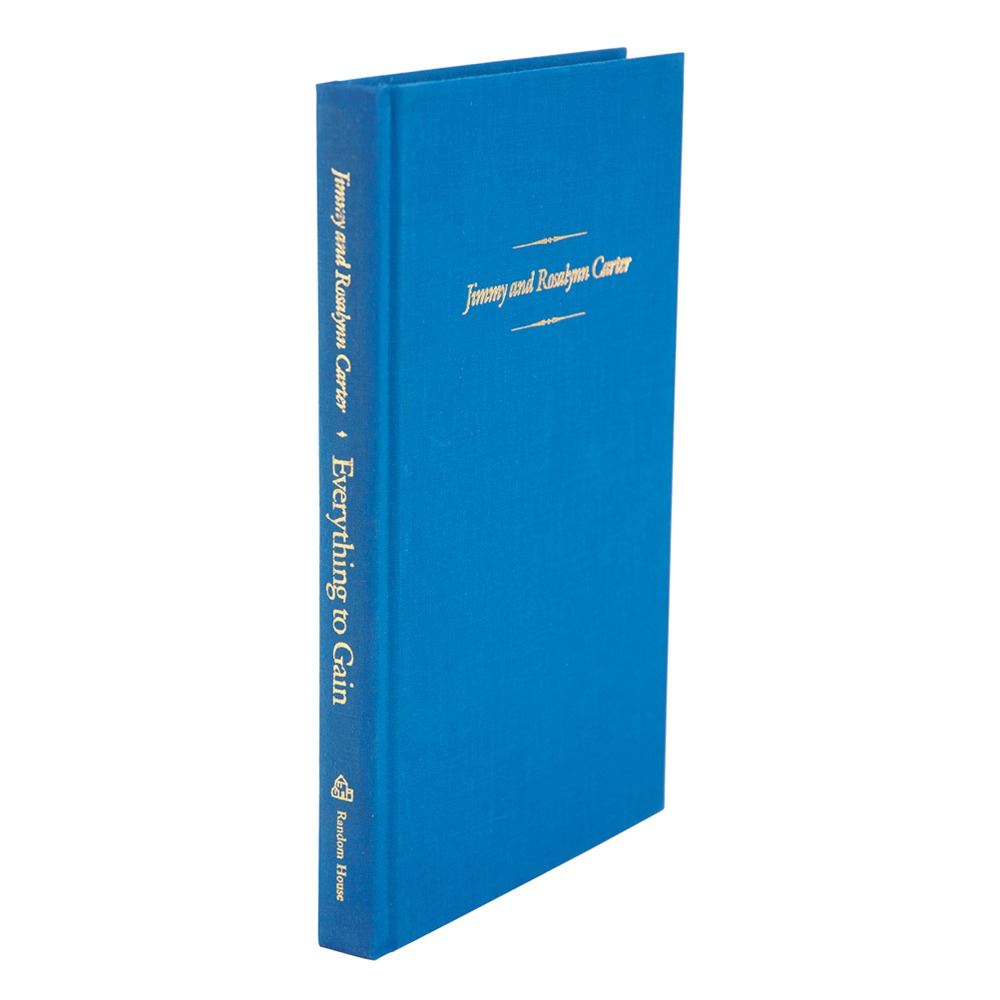 Signed book: Everything to Gain. First edition, limited issue, numbered 280/500. NY: Random House, 1987. Hardcover with slipcase, 6.25 x 9.5, 198 pages. Signed on the colophon in black felt tip, "J. Carter" and "Rosalynn Carter." In very fine condition.