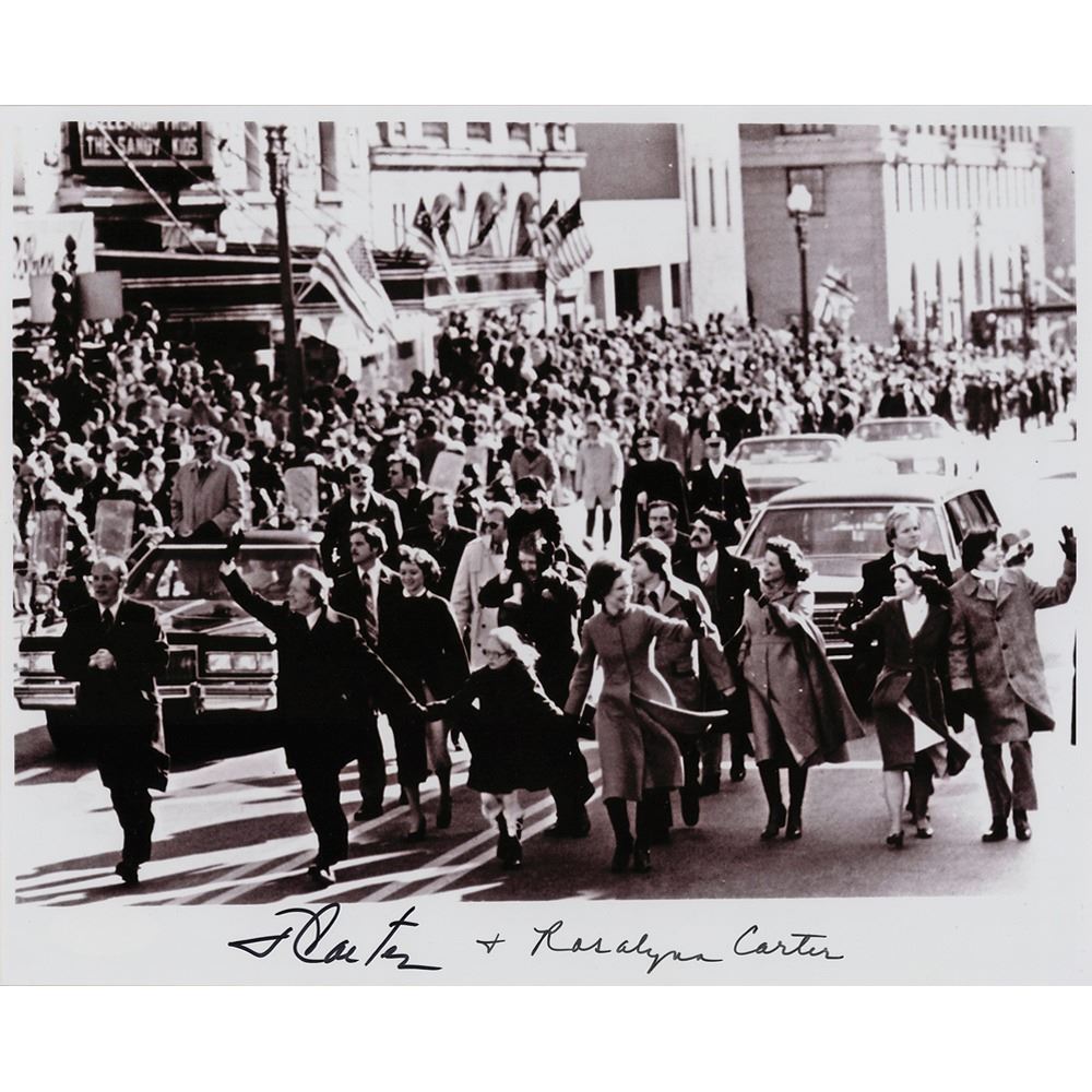 Glossy 10 x 8 photo of President Jimmy Carter walking hand-in-hand with his wife Rosalynn and his daughter Amy during the inaugural parade on January 21, 1977, signed in the lower border in black felt tip, “J. Carter” and “+ Rosalynn Carter.” In very fine condition, with a violet tinge to the image. Accompanied by a certificate of authenticity from JSA. This was the first time in history that a president has not ridden towards the White House in a carriage or automobile in the grand parade to celebrate his taking the oath of office.
