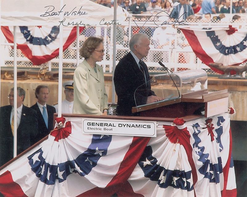 Color satin-finish 10 x 8 photo of the Carters at a General Dynamics event, signed in black felt tip, “Best wishes, Rosalynn Carter” and “J. Carter.” In fine condition, with some light creases to top left corner tip.