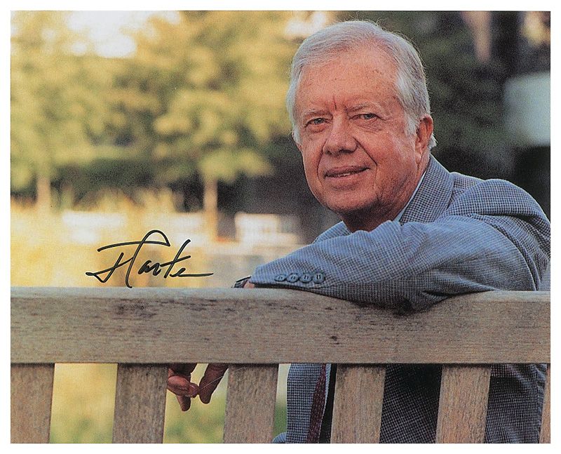 Two color satin-finish 10 x 8 photos of the Carters posing individually, each signed in black felt tip. In fine condition.