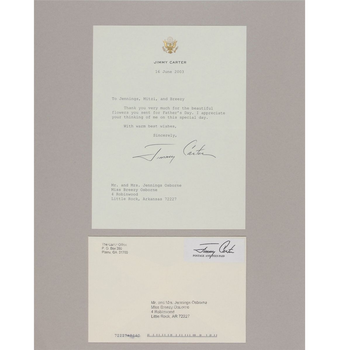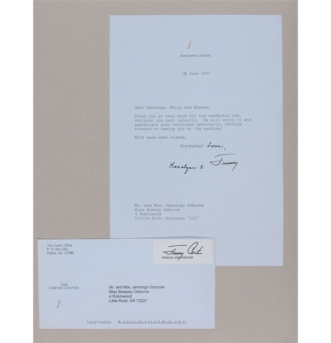 Two letters: one TLS signed “Jimmy Carter,” one page, 6.25 x 8.25, personal letterhead, June 16, 2003. In part: “Thank you for the beautiful flowers you sent for Father’s Day”; and a TLS signed “Jimmy” and “Love, Rosalynn,” one page, 7.25 x 10.5, personal letterhead, June 18, 2003. In part: “Thank you so much for the wonderful Dom Perignon you sent recently.” Both letters are securely affixed with their original mailing envelopes to opposite sides of an 11.75 x 14.5 scrapbook page. In overall fine condition.