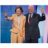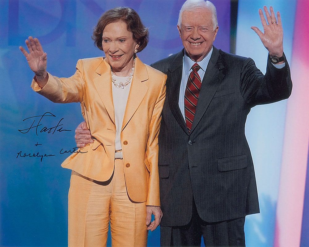 Color satin-finish 10 x 8 photo of the Carters waving from the stage of an event, signed in black felt tip, “J. Carter,” and “& Rosalynn Carter.” In very fine condition.