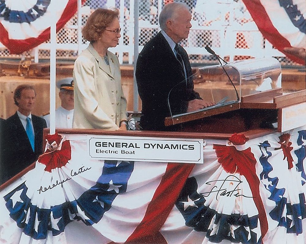 Color satin-finish 10 x 8 photo of the Carters at a General Dynamics event, signed in black felt tip, “J. Carter” and “Rosalynn Carter.” In fine condition.