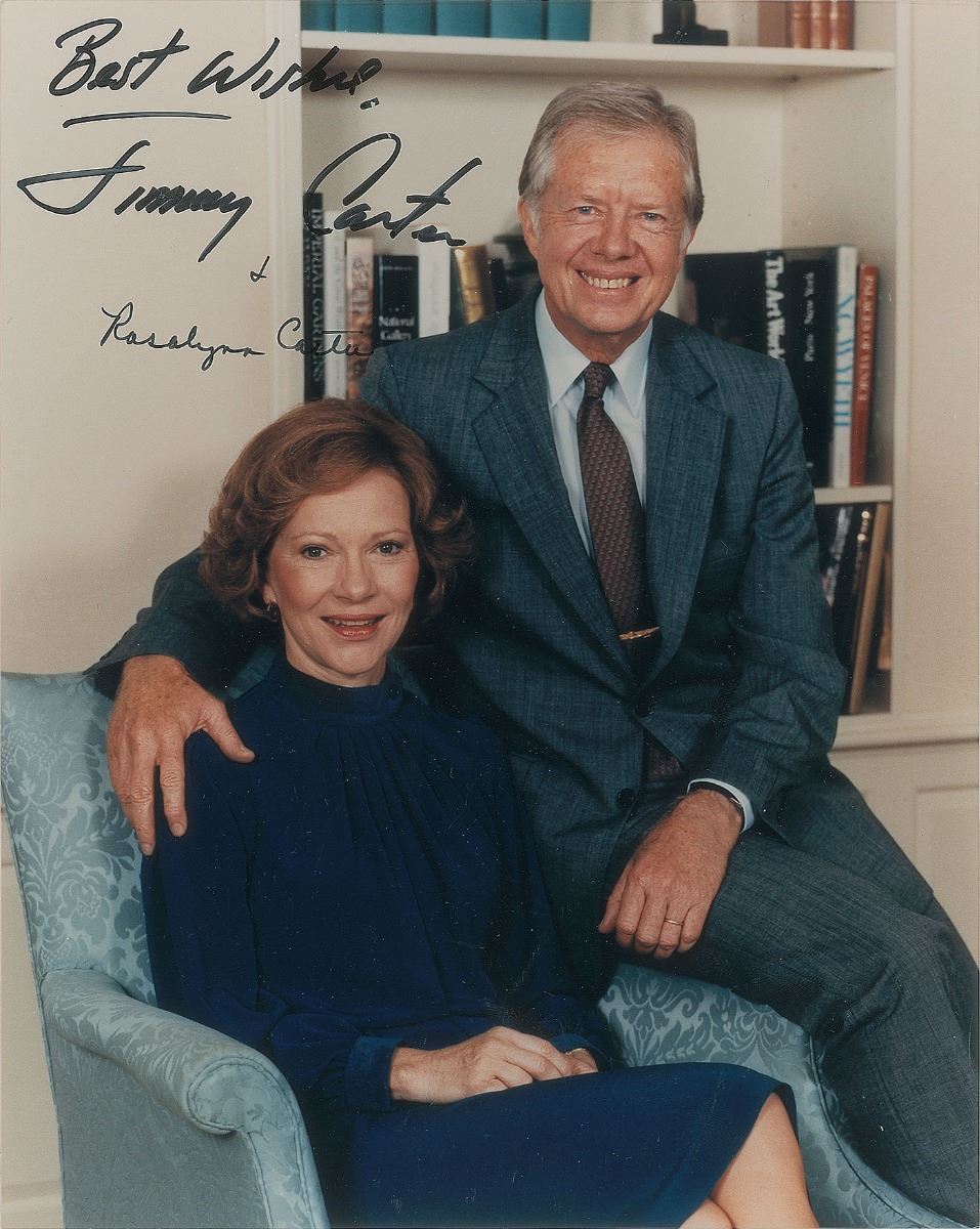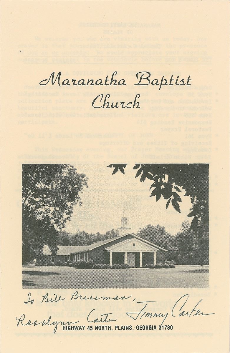 Two items: a color satin-finish 8 x 10 photo of the first couple, signed in black felt tip, “Best wishes, Jimmy Carter” and “Rosalynn Carter”; and a pamphlet for the Maranatha Baptist Church, signed and inscribed in the lower border in black ink, “To Bill Breseman, Rosalynn Carter,” and “Jimmy Carter.” In overall fine condition, with a few light bends and creases to the signed photo.