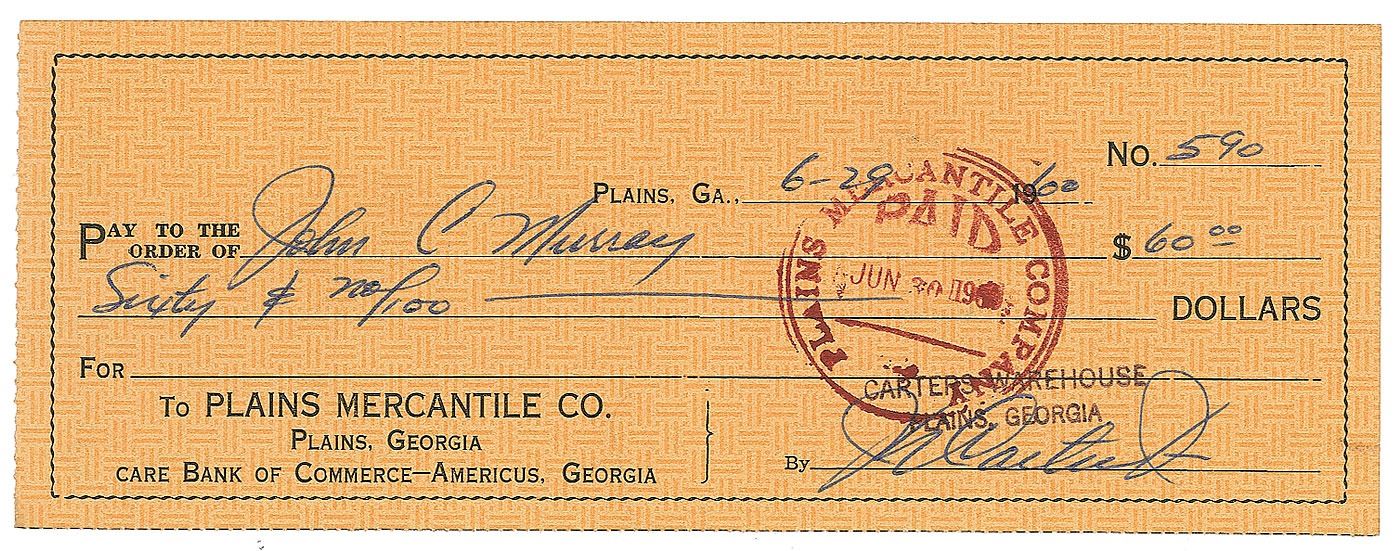 Two Plains Mercantile Co. checks, both 8.25 x 3, individually filled out and signed by Jimmy or Rosalyn Carter, "J. E. Carter, Jr.," and "Rosalynn S. Carter," dated June 29, 1960, and October 17, 1960. Both featuring "Carters Warehouse" stamps. In overall fine condition.