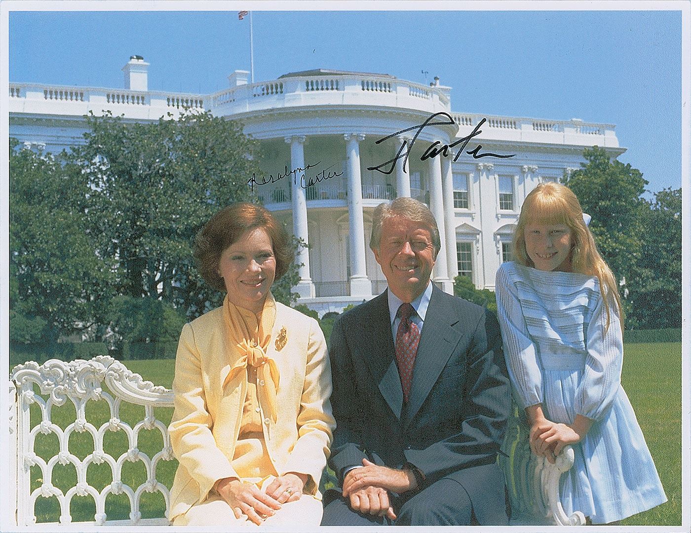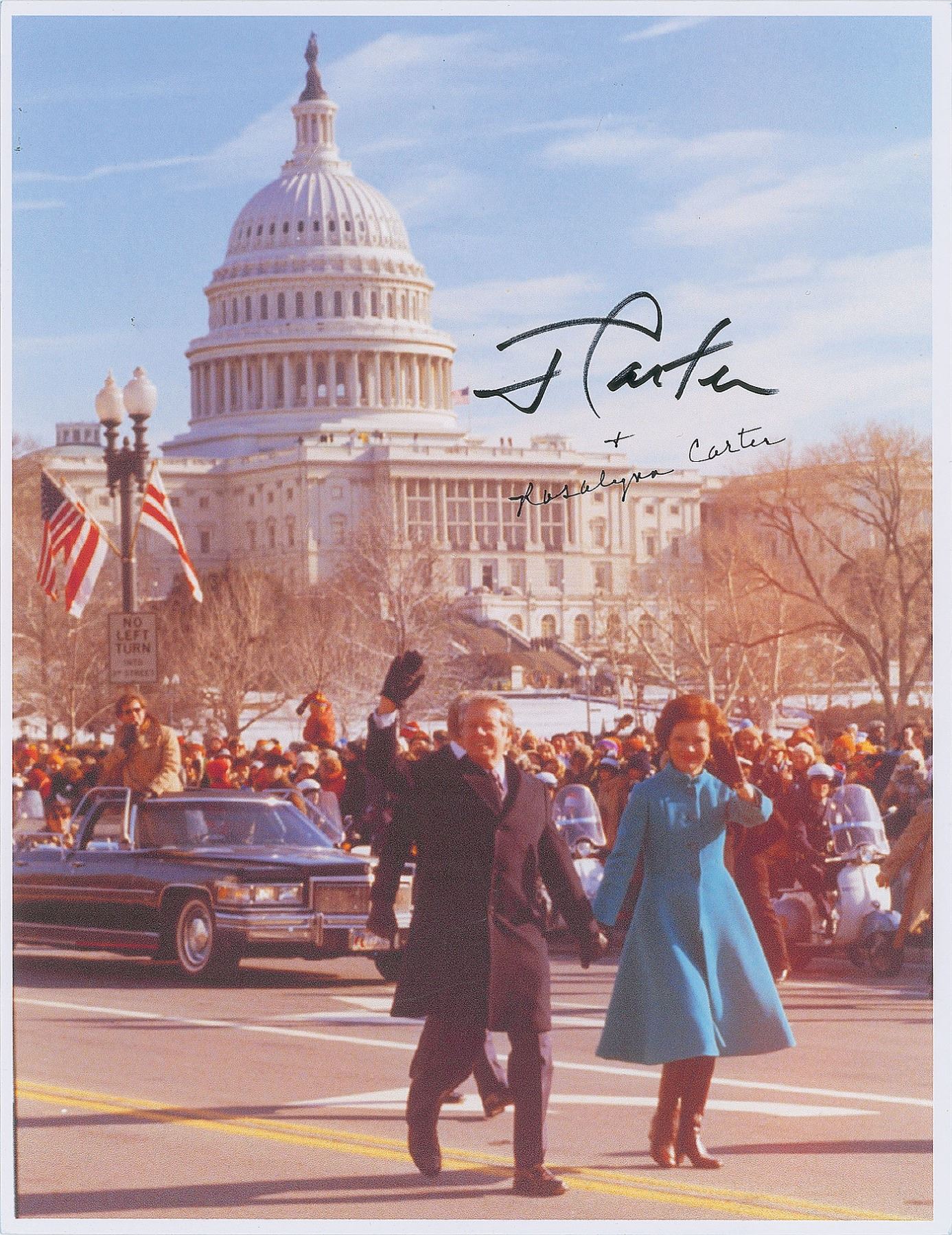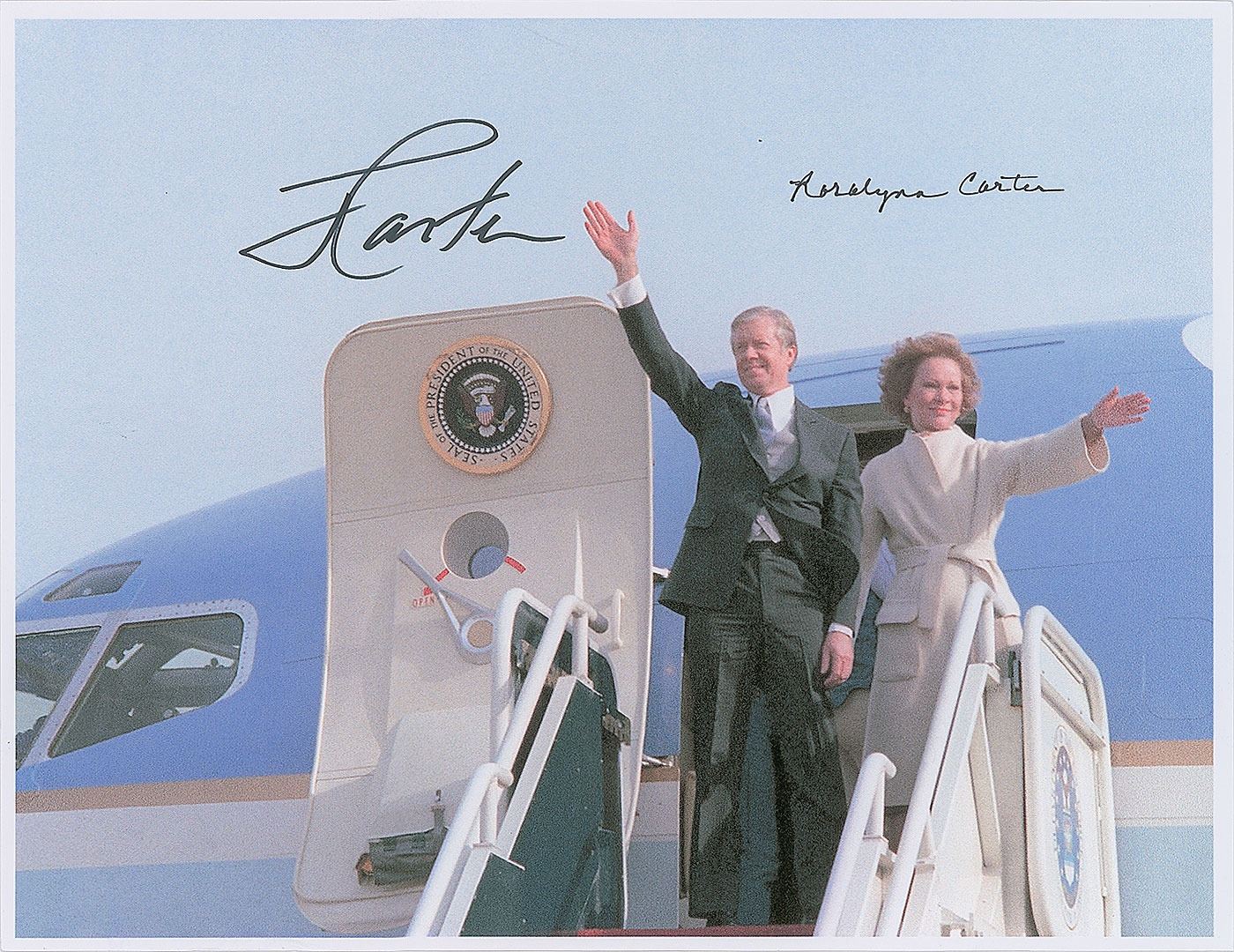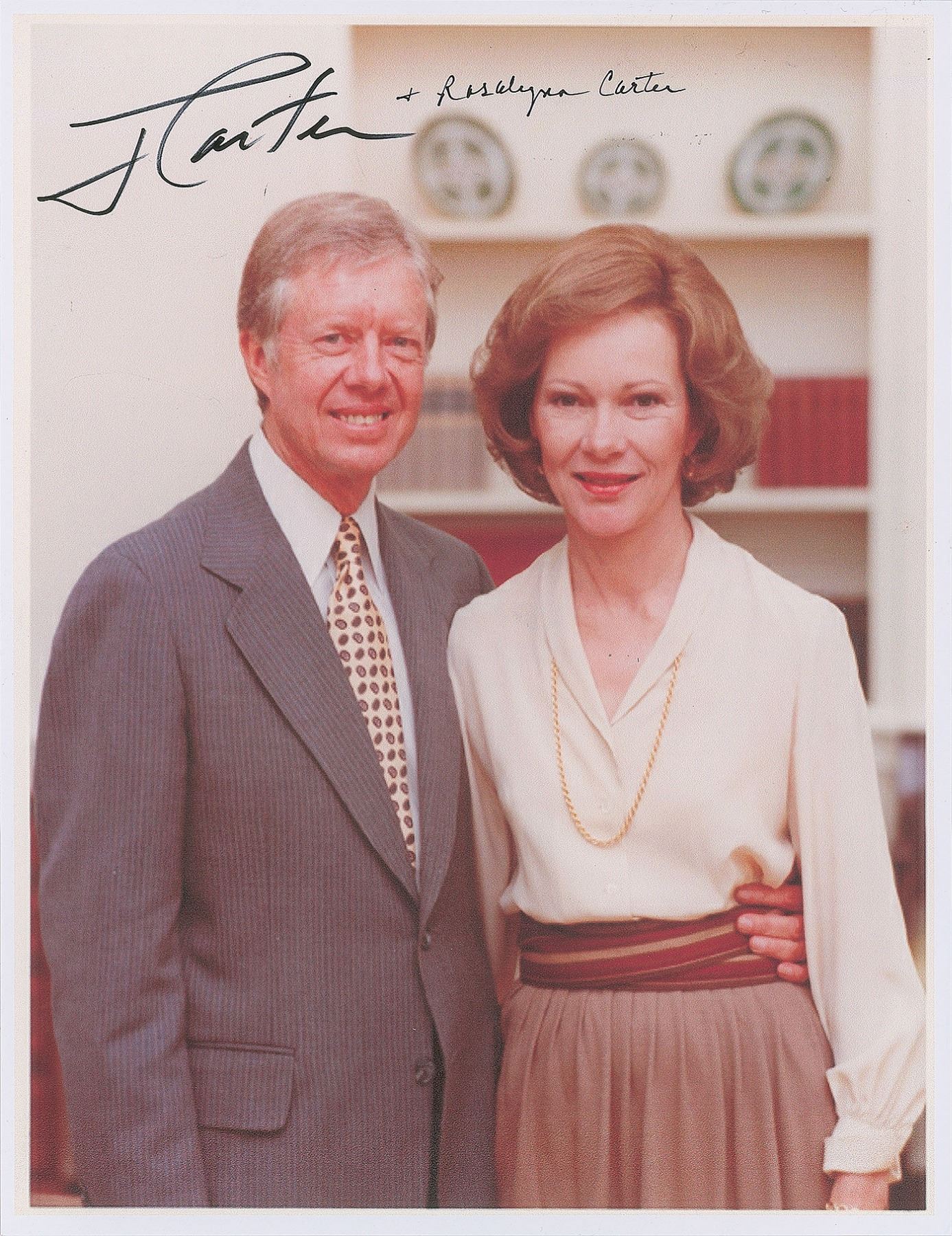 Group of five color laserprint photos of Jimmy and Rosalynn Carter during their time in the White House, 8.5 x 11 and 11 x 8.5, each signed in black felt tip, "J. Carter," and in black ink, "Rosalynn Carter." In overall very fine condition.