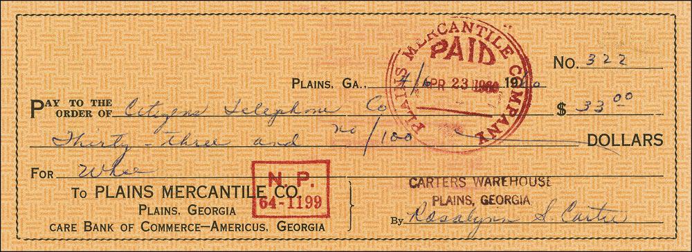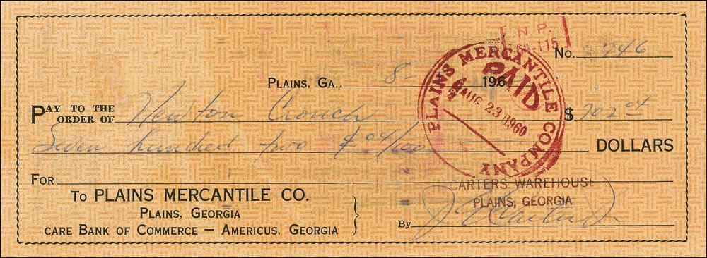Two Plains Mercantile Company checks, 8.5 x 3, both from the early 1960s, one signed “J. E. Carter, Jr.,” and one signed “Rosalynn S. Carter.” In very good condition, with expected cancellations, bank stamp lightly touching both signatures, a few small holes to the Jimmy Carter check, and an area of discoloration. Accompanied by two unsigned photos. RRAuction COA.