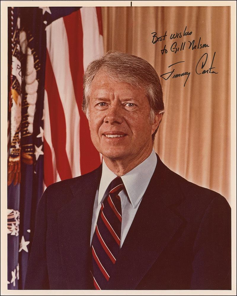 Two color satin-finish 8 x 10 photos of the president and first lady, each signed and inscribed in black felt tip to Gill Nelson by Jimmy and Rosalynn Carter respectively. In fine condition. RRAuction COA.