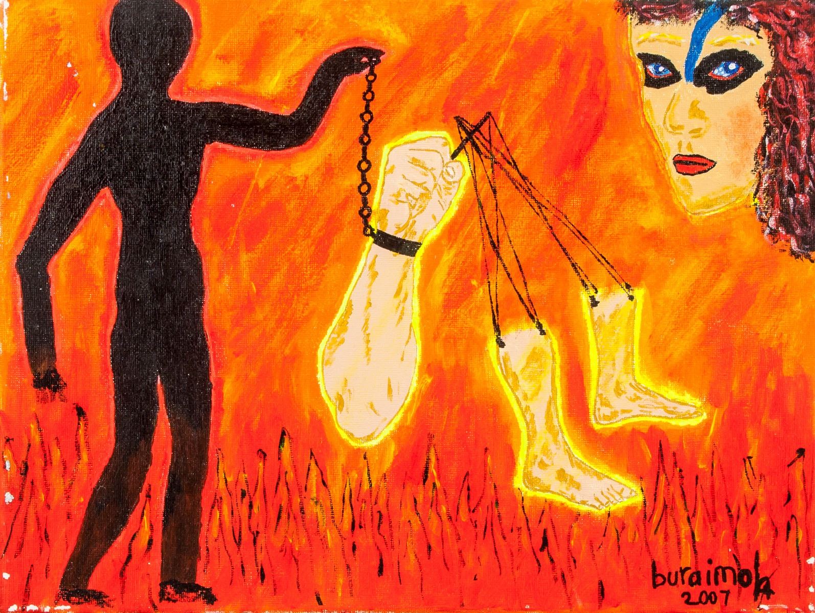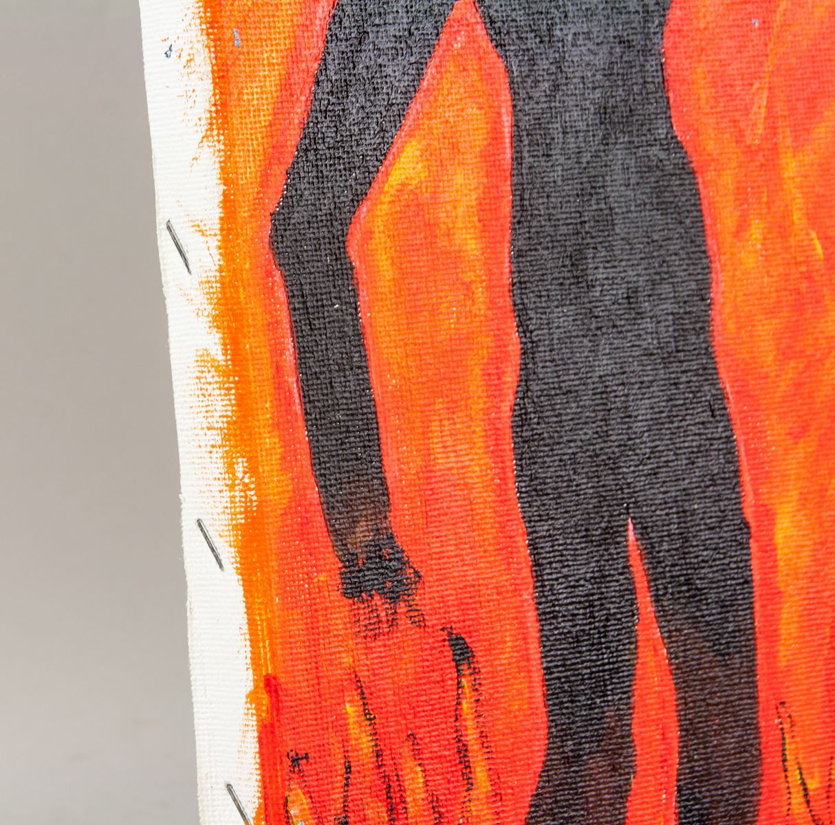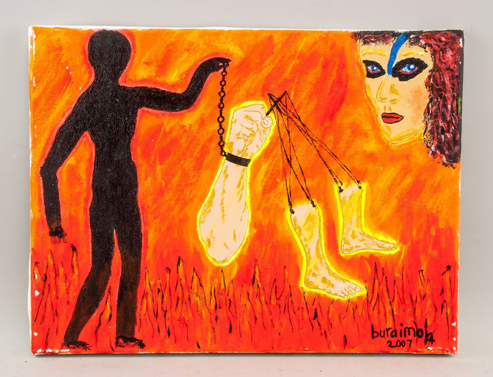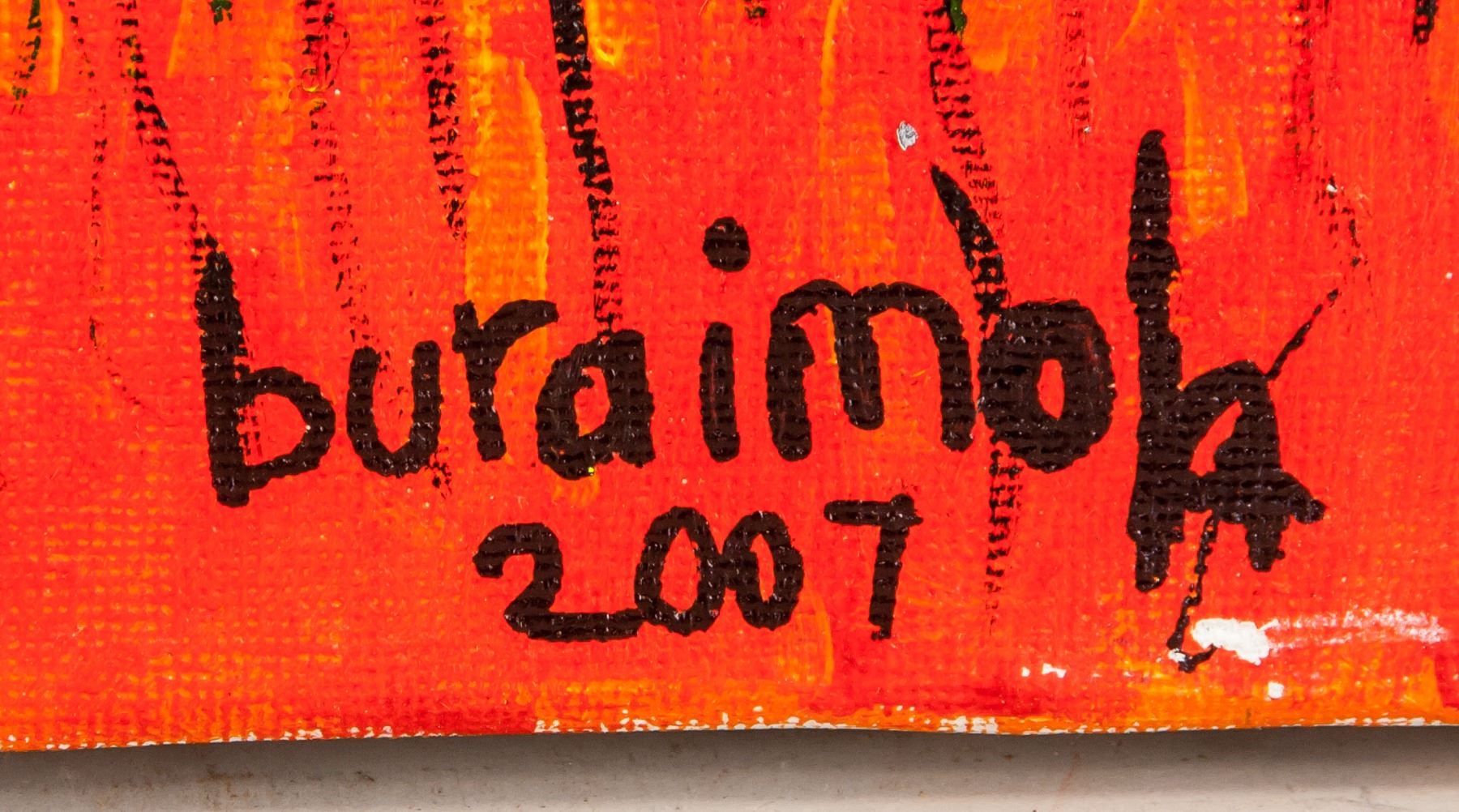 Acrylic on canvas. Featuring a surrealist figure. Signed Buraimoh on the lower right corner. Attributed to Jimoh Buraimoh (born 1943, Nigerian). 30 x 40 cm (11.8 x 15.7 in). PROVENANCE: This item has limited provenance from a private American collection (Texas)