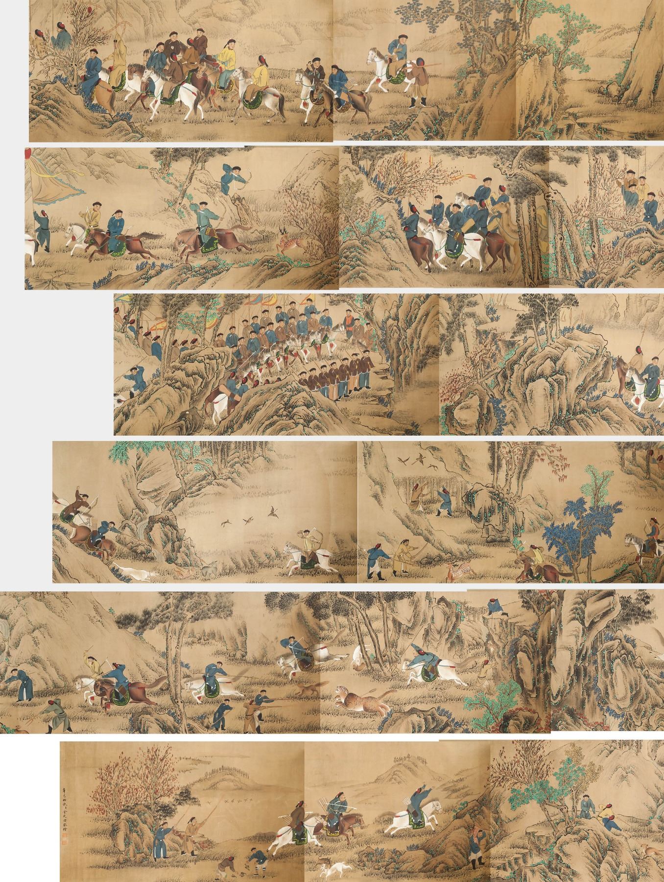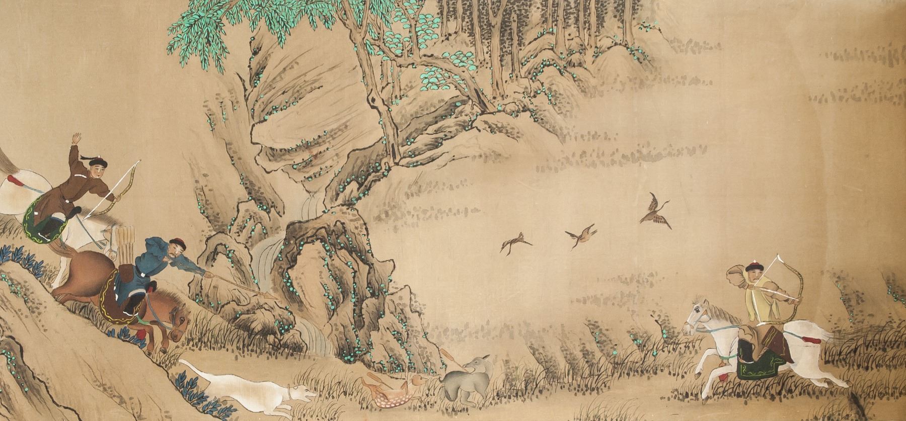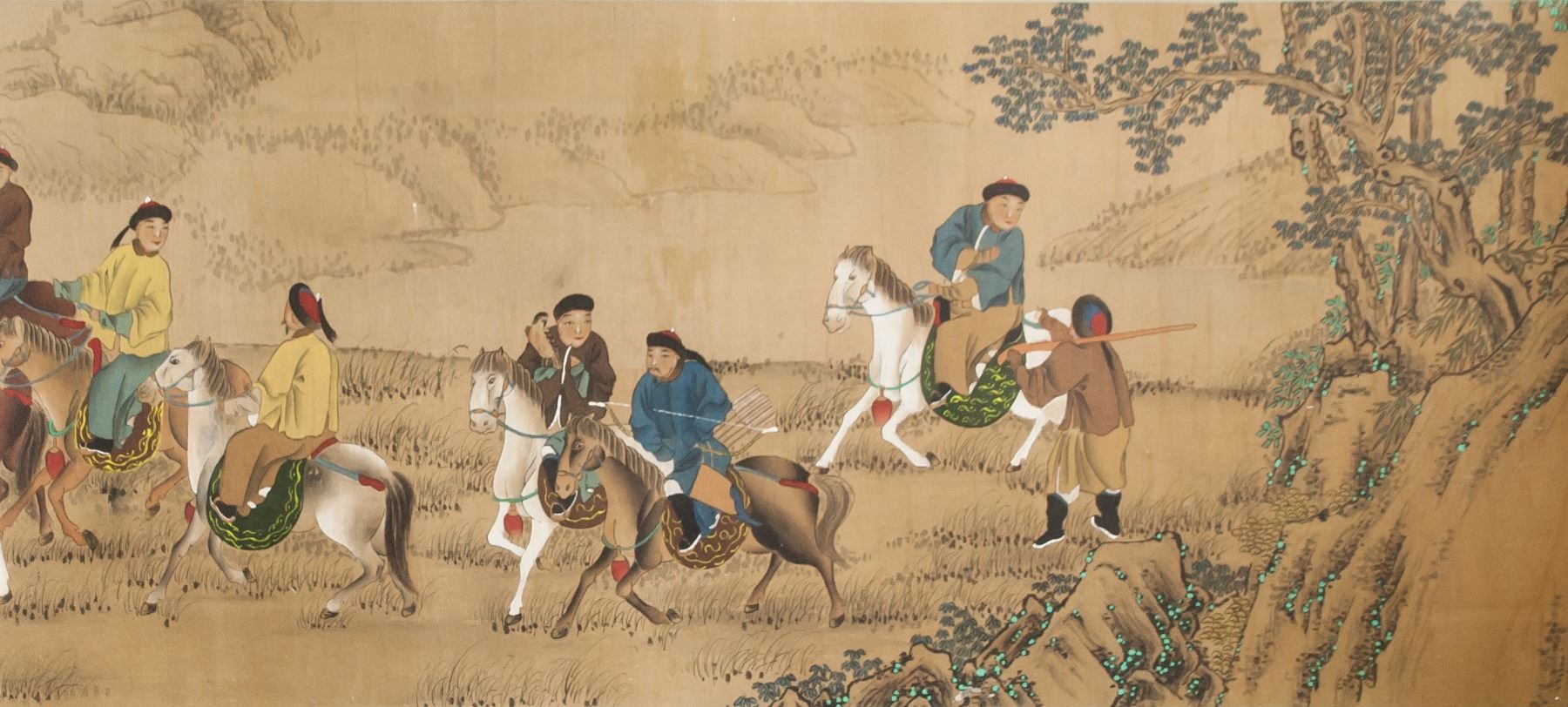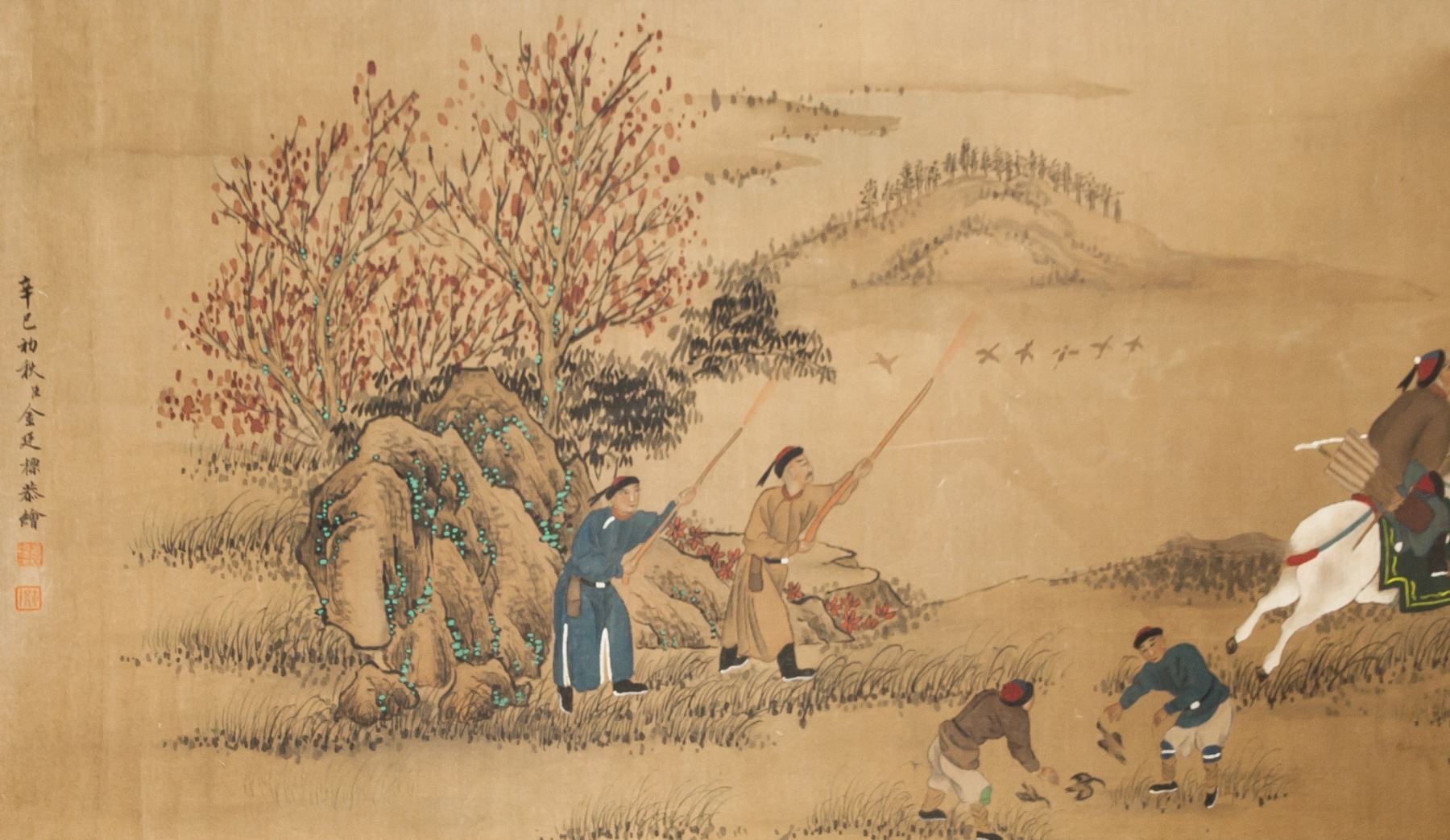 Ink and watercolor on silk, horizontal scroll. Featuring hunting scene. Signed Jin Tingbiao (Qing dynasty, Chinese), inscribed with 2 artist seals. 1022 x 43 cm. PROVENANCE: T. Ng Collection, Toronto.