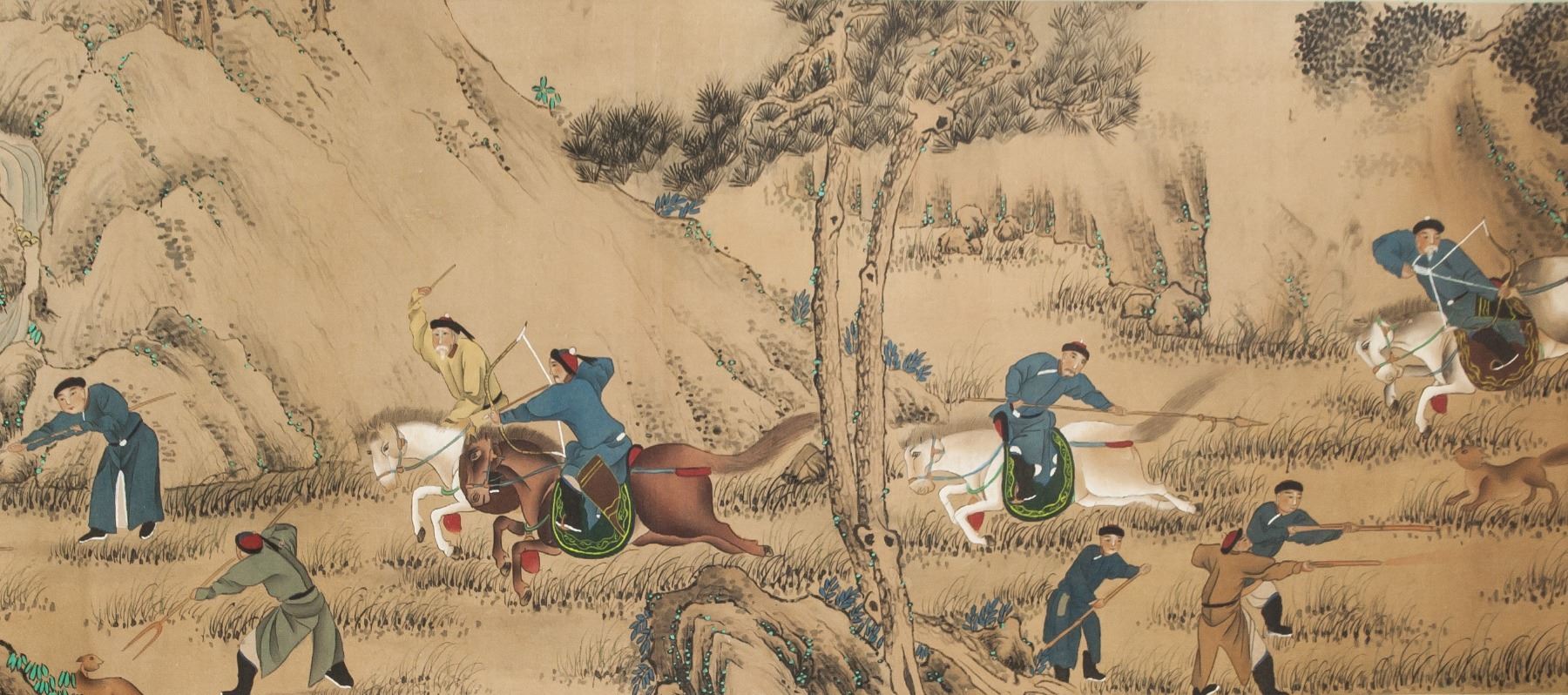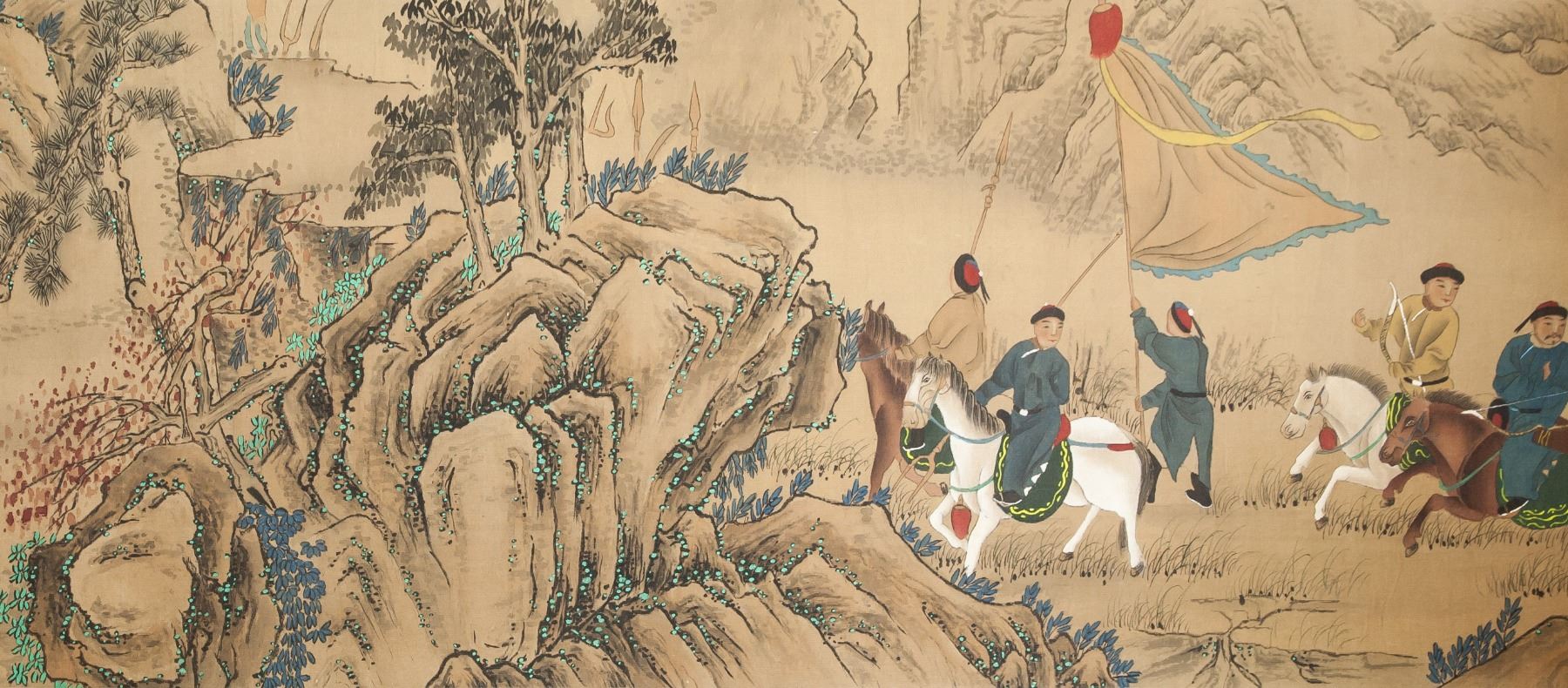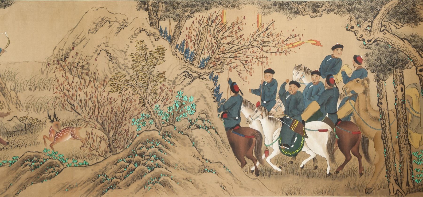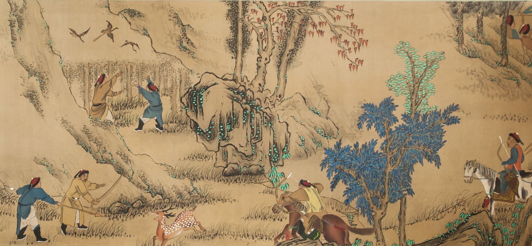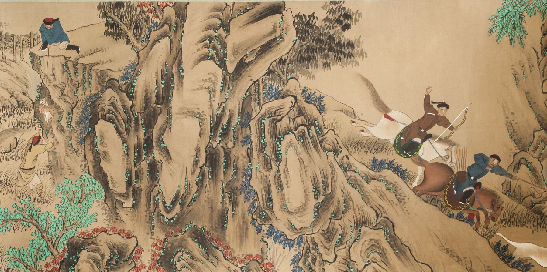Ink and watercolor on silk, horizontal scroll. Featuring hunting scene. Signed Jin Tingbiao (Qing dynasty, Chinese), inscribed with 2 artist seals. 1022 x 43 cm. PROVENANCE: T. Ng Collection, Toronto.