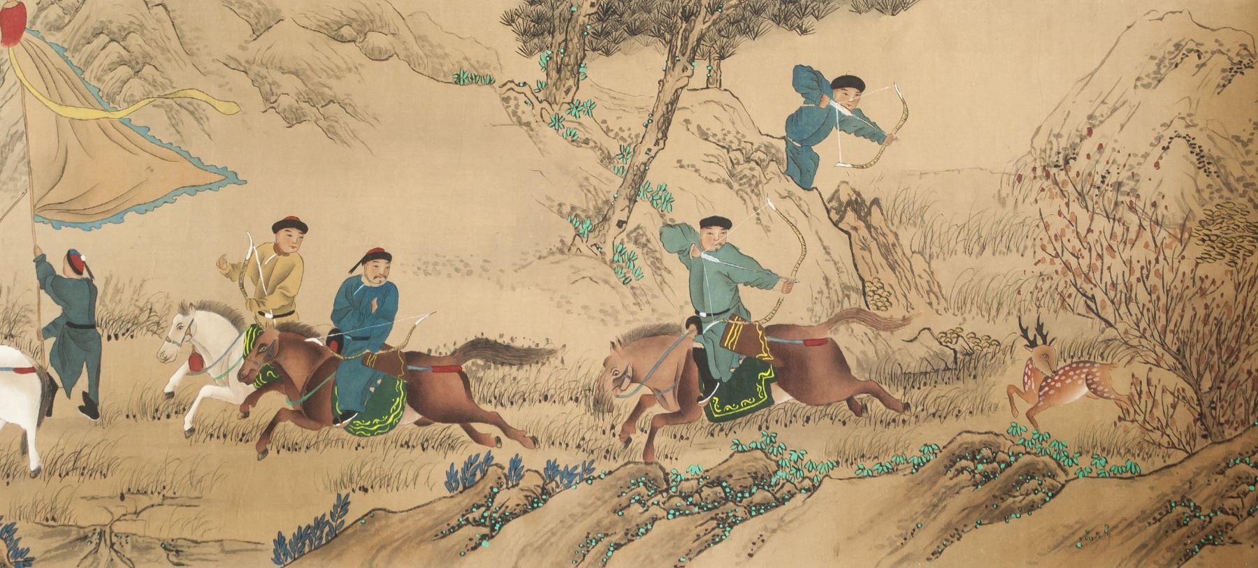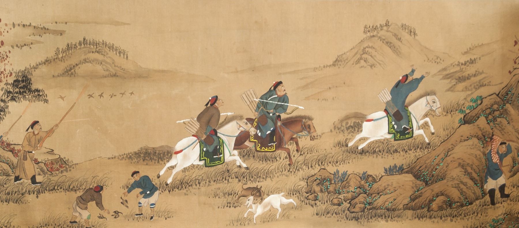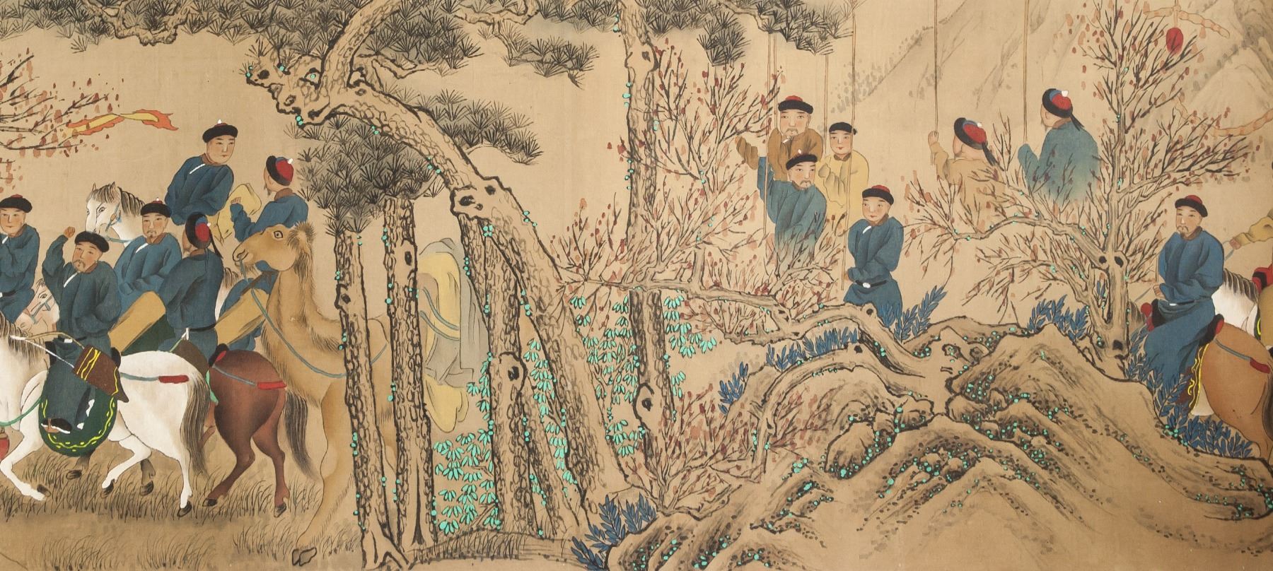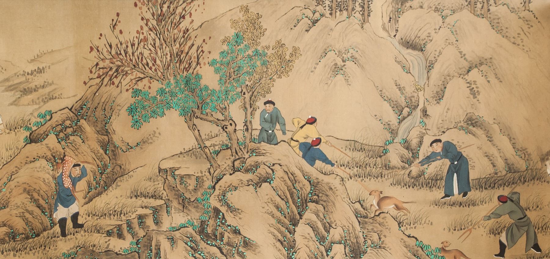 Ink and watercolor on silk, horizontal scroll. Featuring hunting scene. Signed Jin Tingbiao (Qing dynasty, Chinese), inscribed with 2 artist seals. 1022 x 43 cm. PROVENANCE: T. Ng Collection, Toronto.