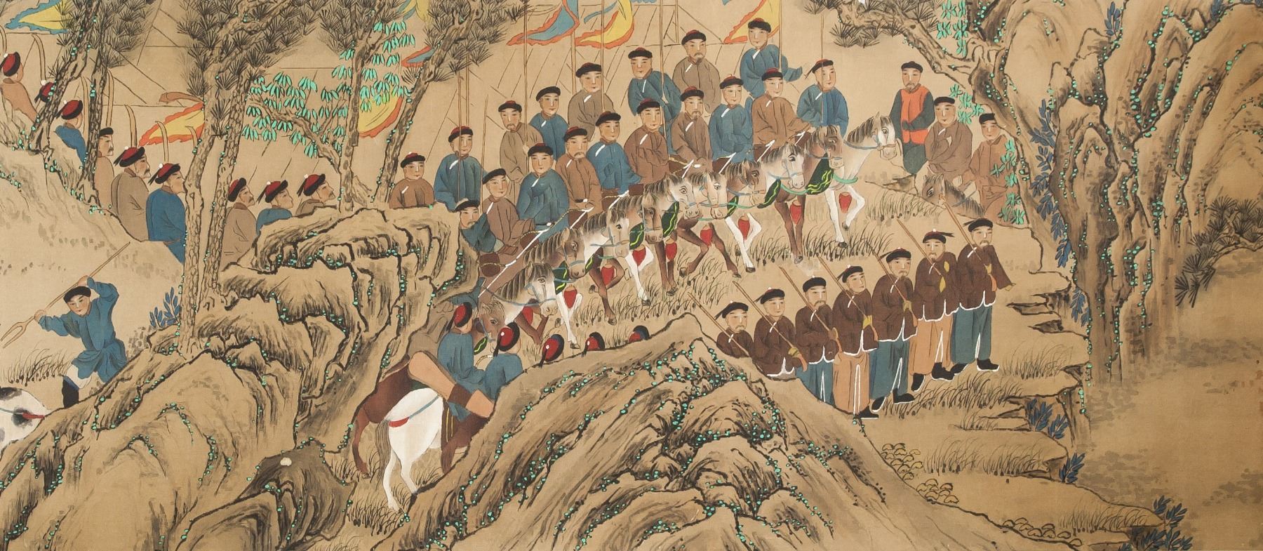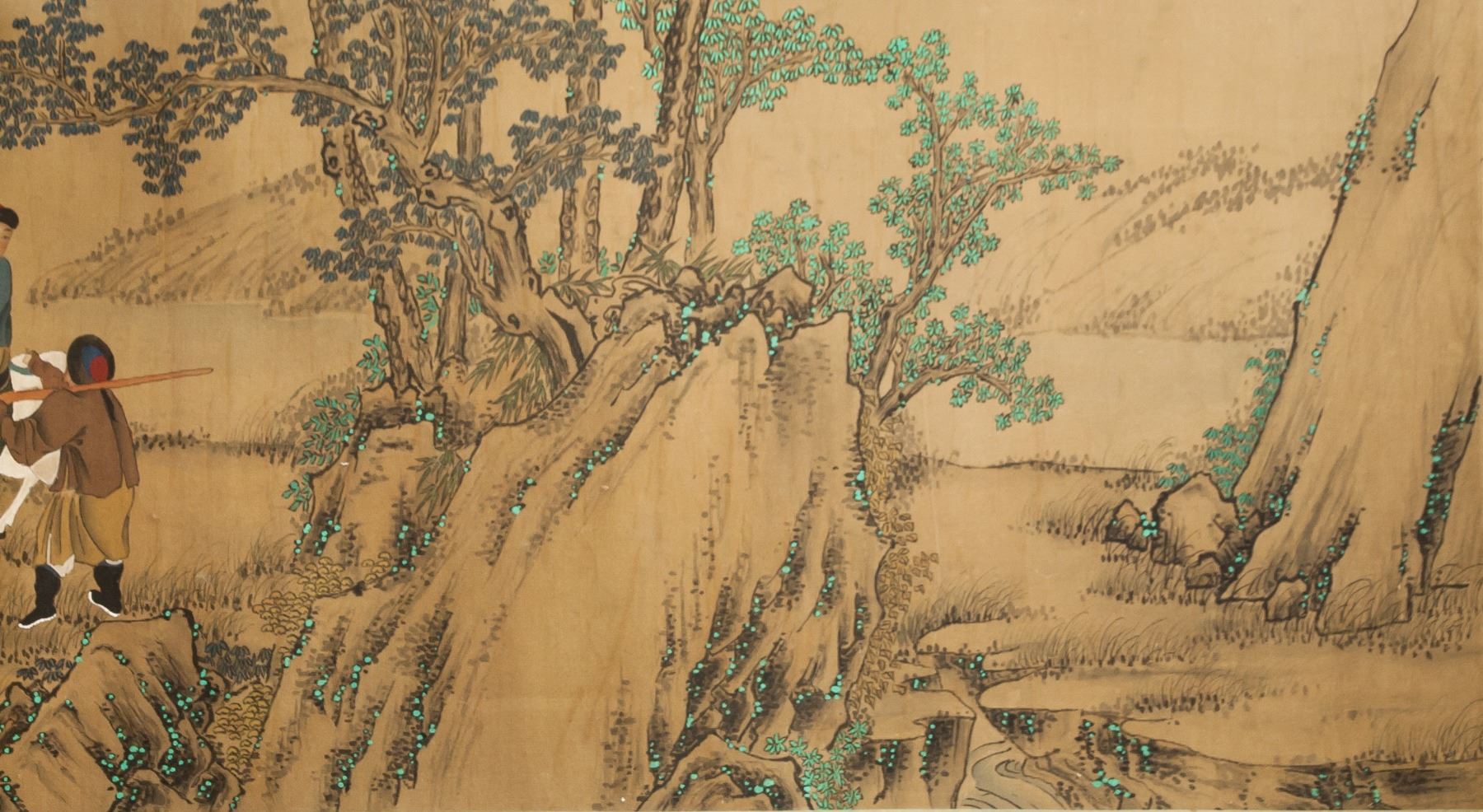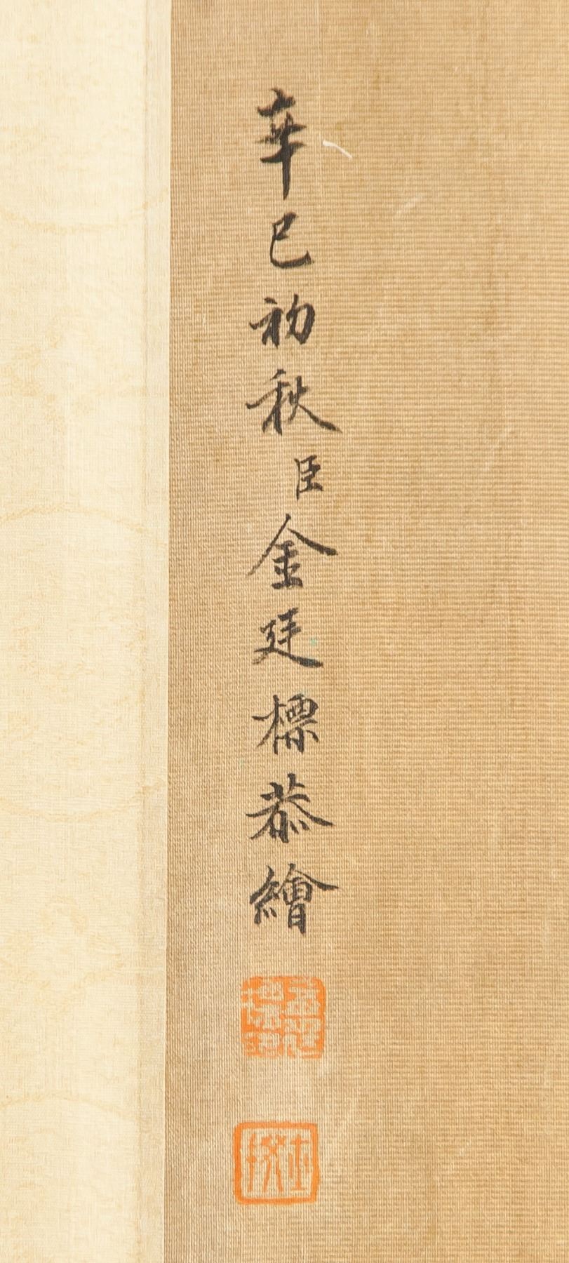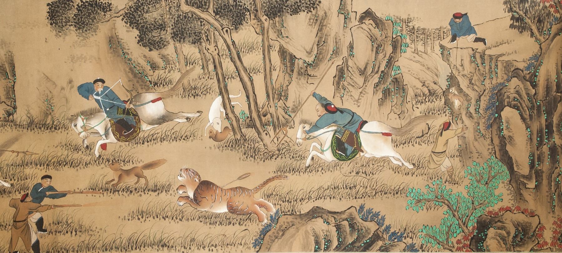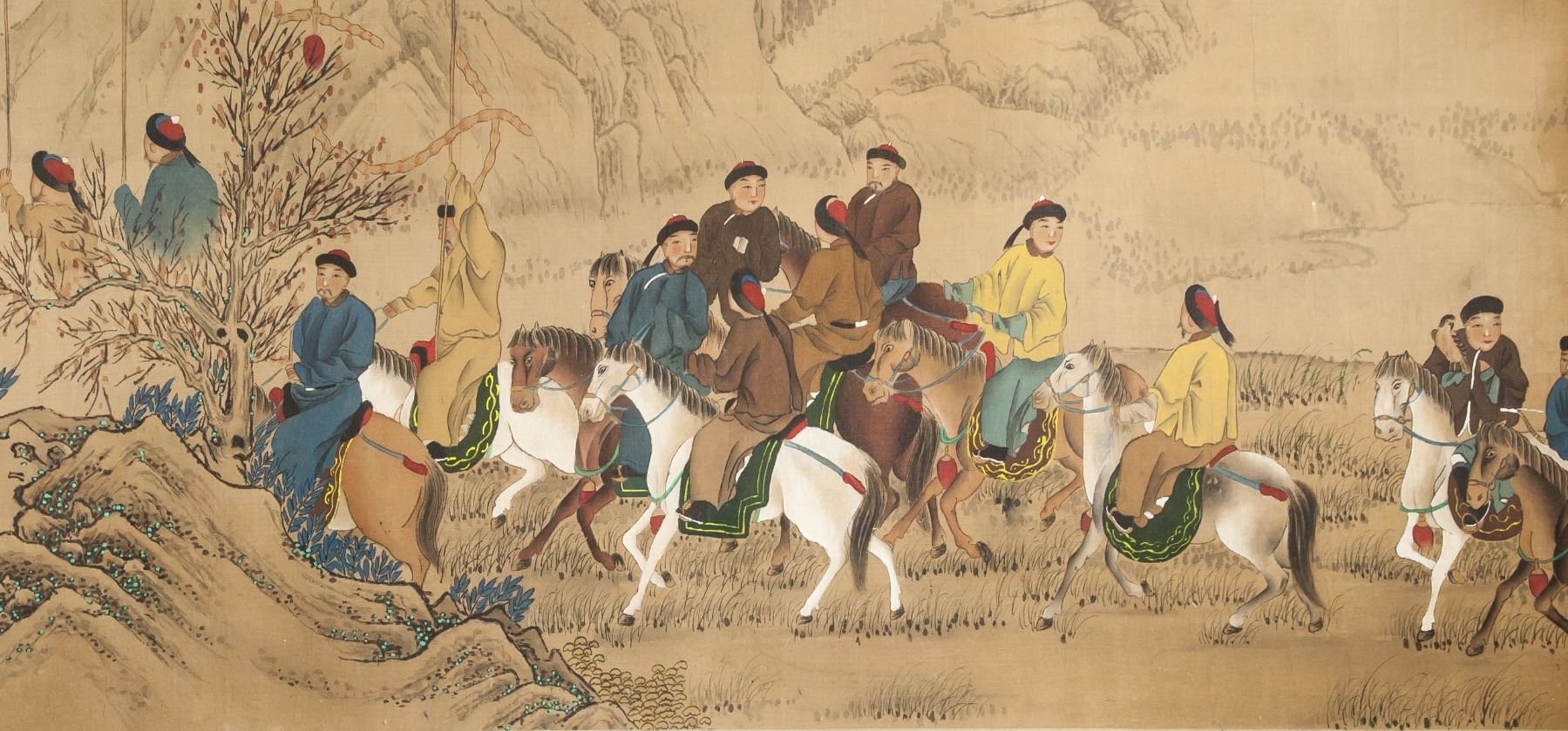 Ink and watercolor on silk, horizontal scroll. Featuring hunting scene. Signed Jin Tingbiao (Qing dynasty, Chinese), inscribed with 2 artist seals. 1022 x 43 cm. PROVENANCE: T. Ng Collection, Toronto.