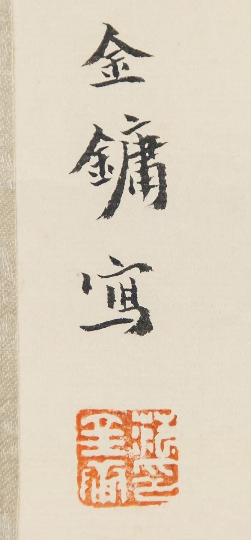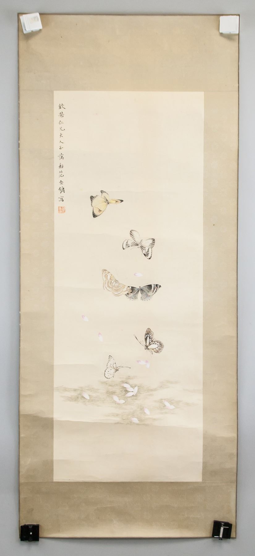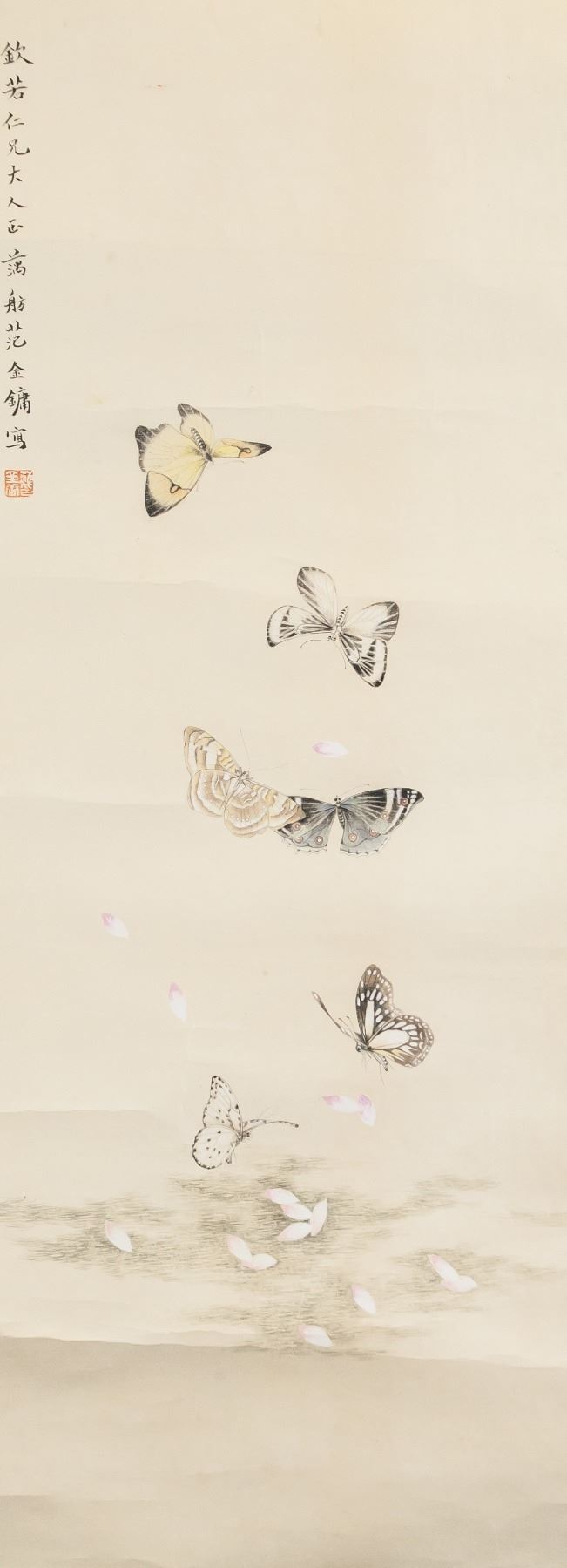 Chinese ink and watercolor on paper scroll. Featuring butterflies. Signed "Jin Yong" in Chinese characters. Inscribed with one artist seal. 89 x 34 cm