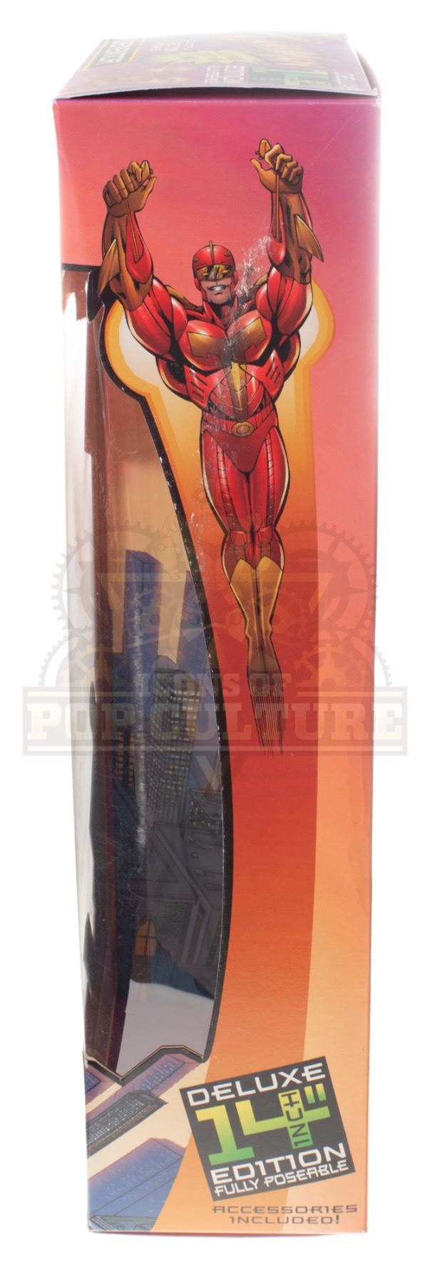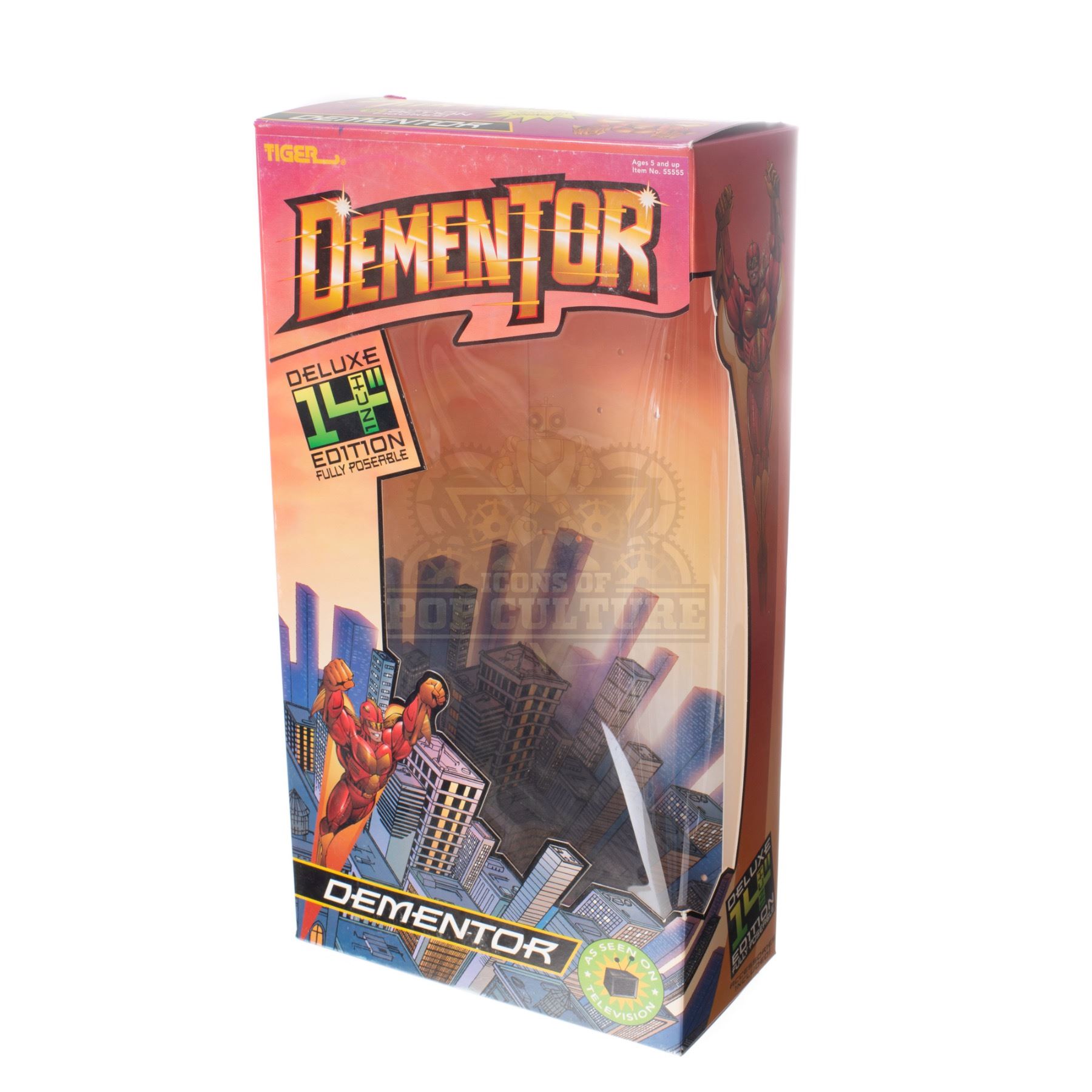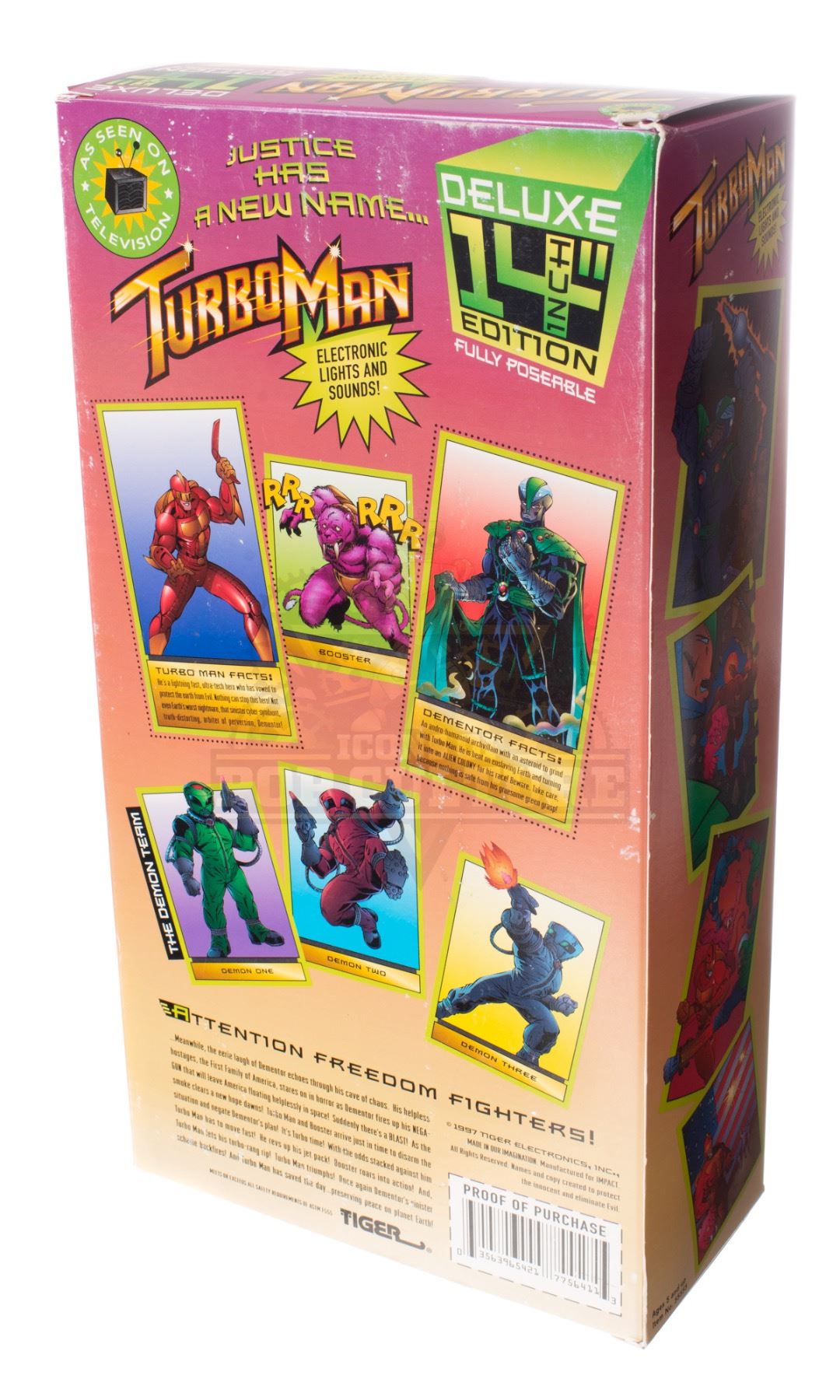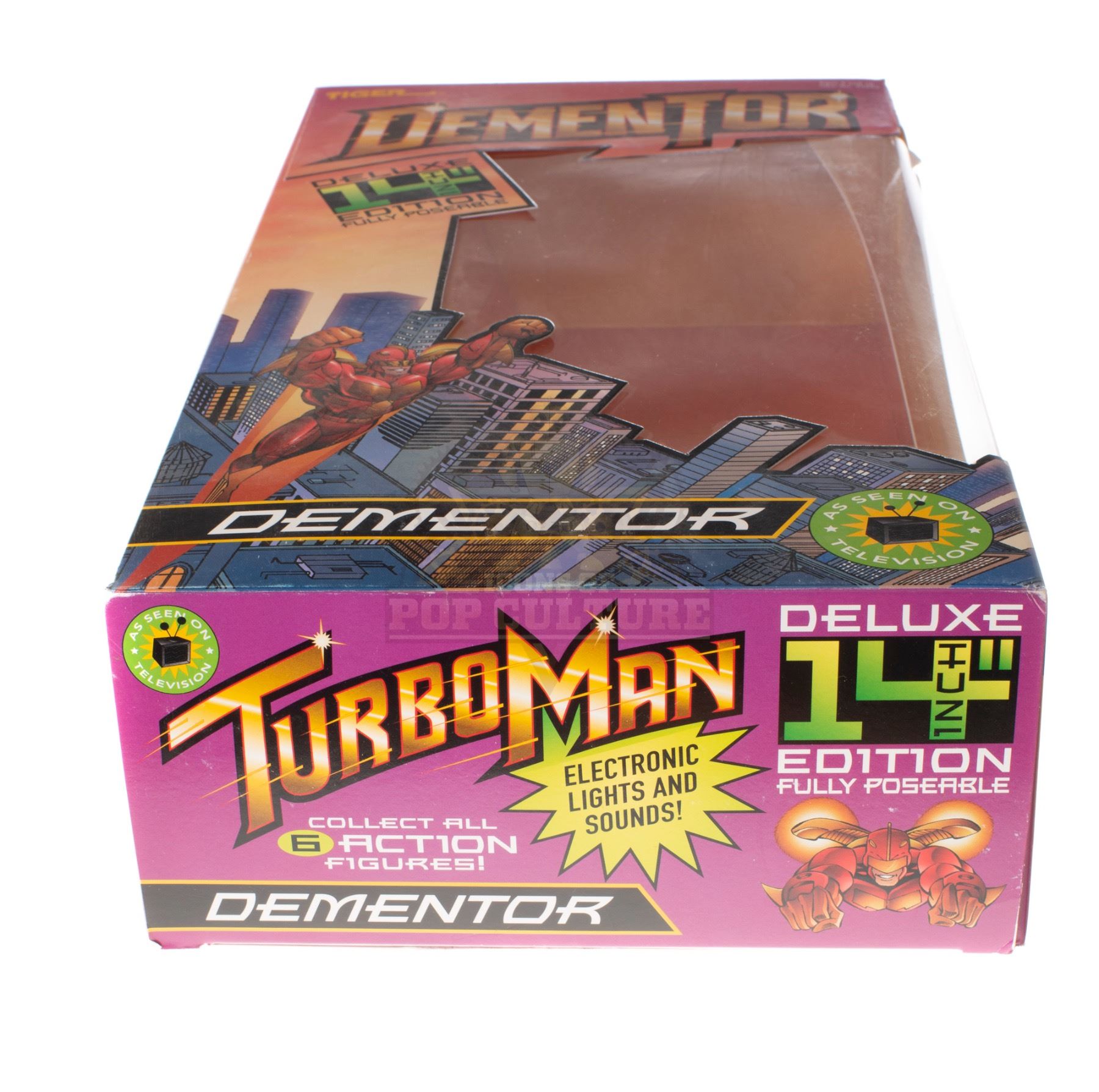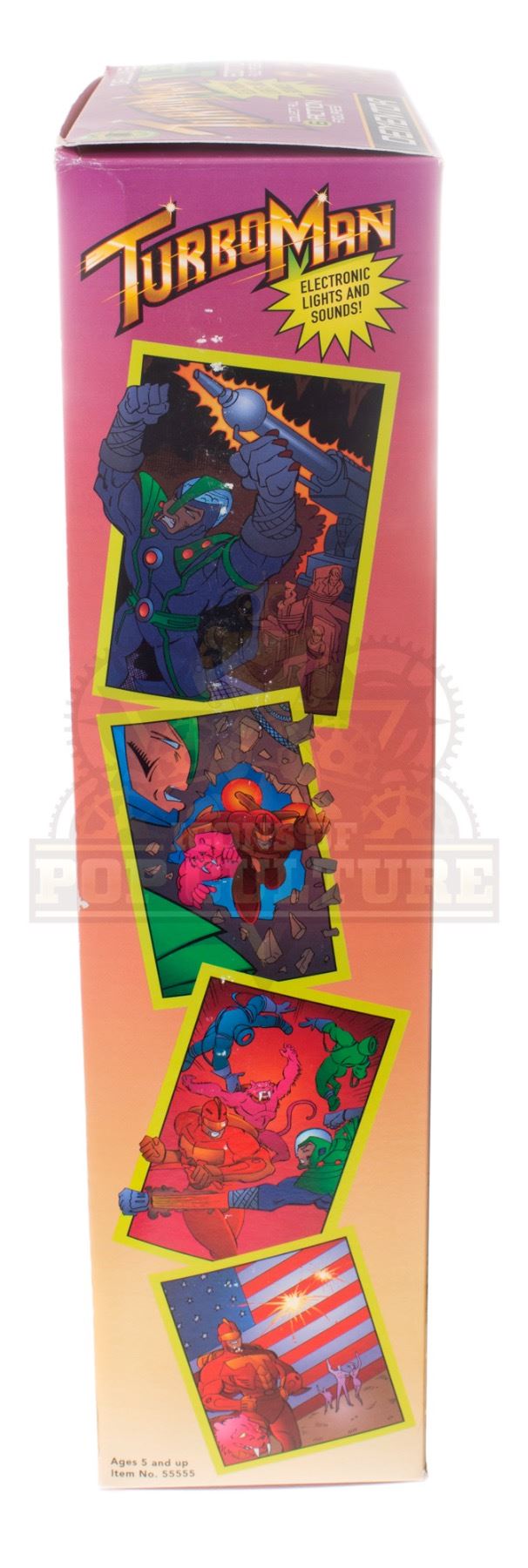 This prop Dementor toy box was custom-made by the production for use by various actors and as set dressing. The box features a clear plastic window and various TurboMan graphics and details on all the characters within the “Turbo Man” Universe. Box measures 16” x 8.75” x 4”. A very iconic prop from Arnold Schwarzenegger’s Christmas classic.