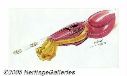 <B>"Jingle All the Way" Concept Art.</B></I> Here is a piece of concept art detailing one of the features of the armored suit worn by Arnold Schwarzenegger in the holiday comedy. The piece is signed by character designer Tim Flattery and is in pristine condition.