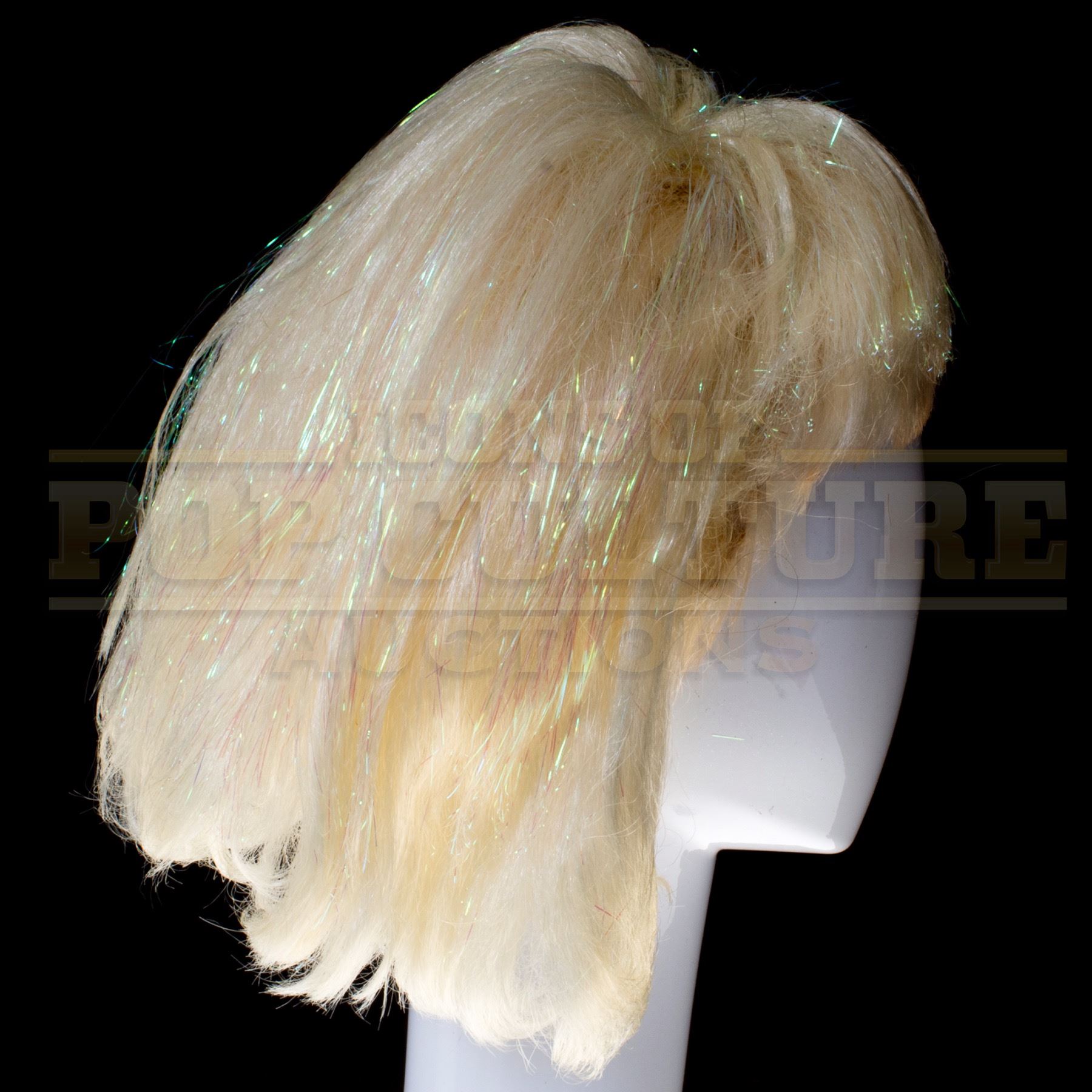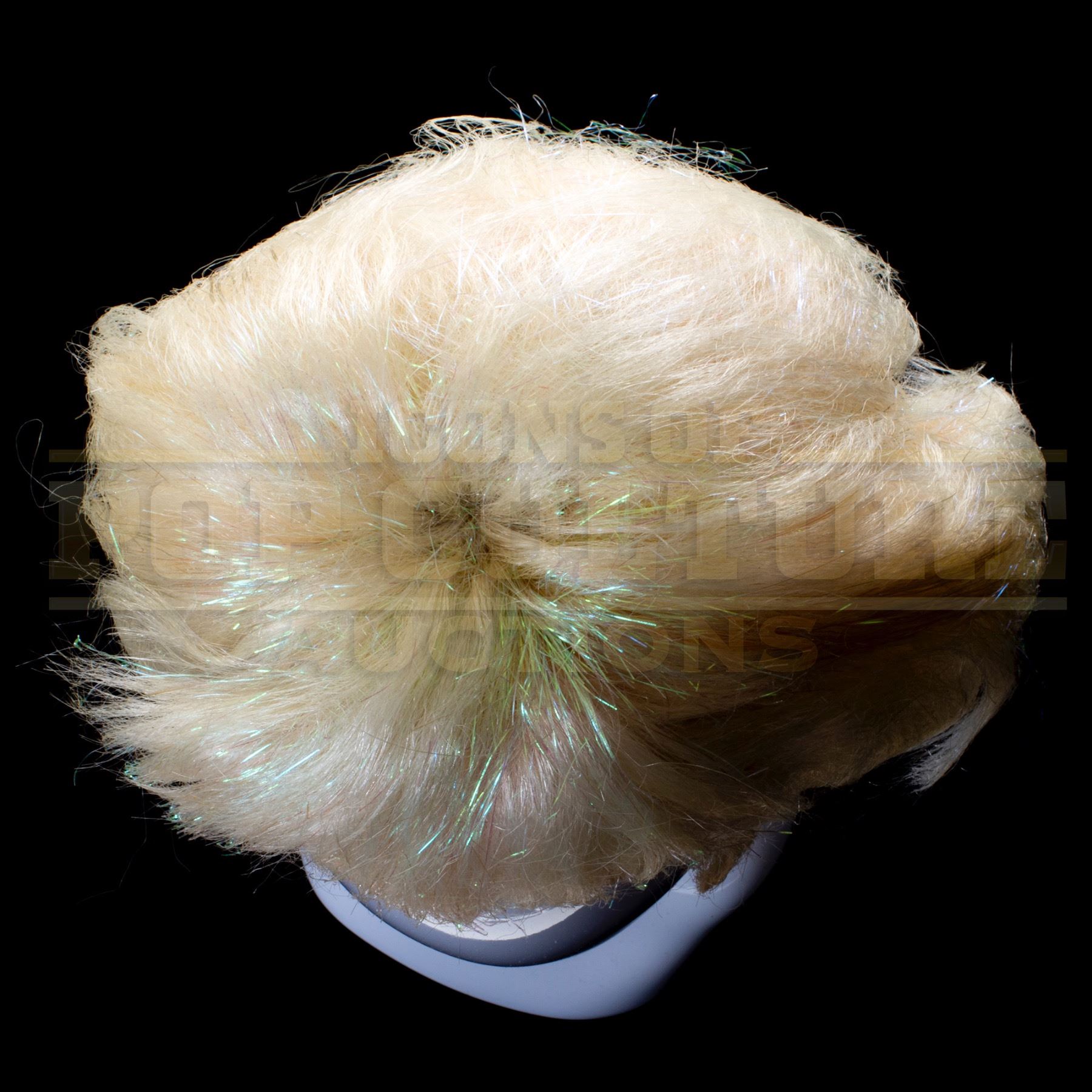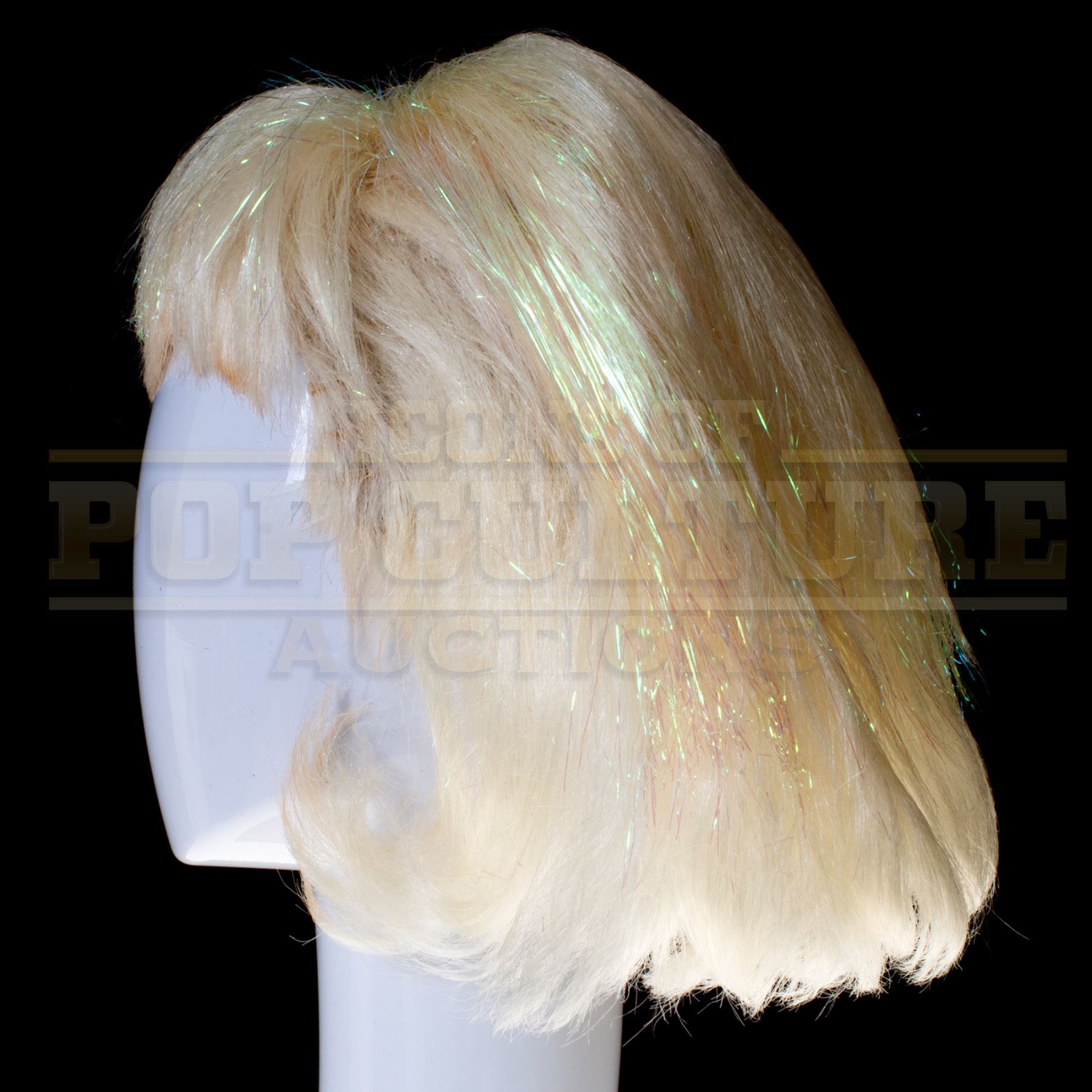 This wig was acquired by the production for use by an uncredited actress as a “Wintertainment Parade Ice Princess”. The white wig features iridescent highlights and is marked “N.H.” on the inside. The wig is seen early in the parade scenes as the Ice Princess float passes the broadcast booth.