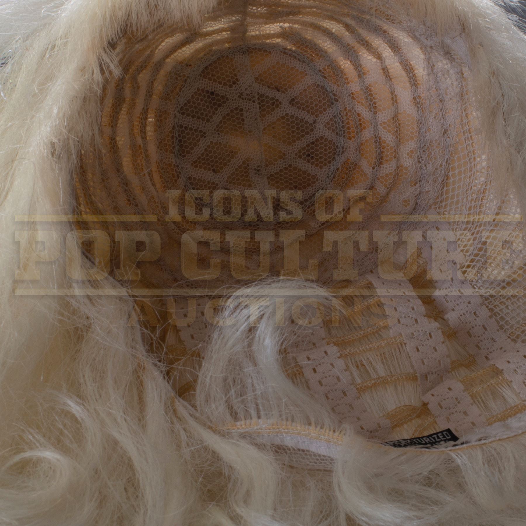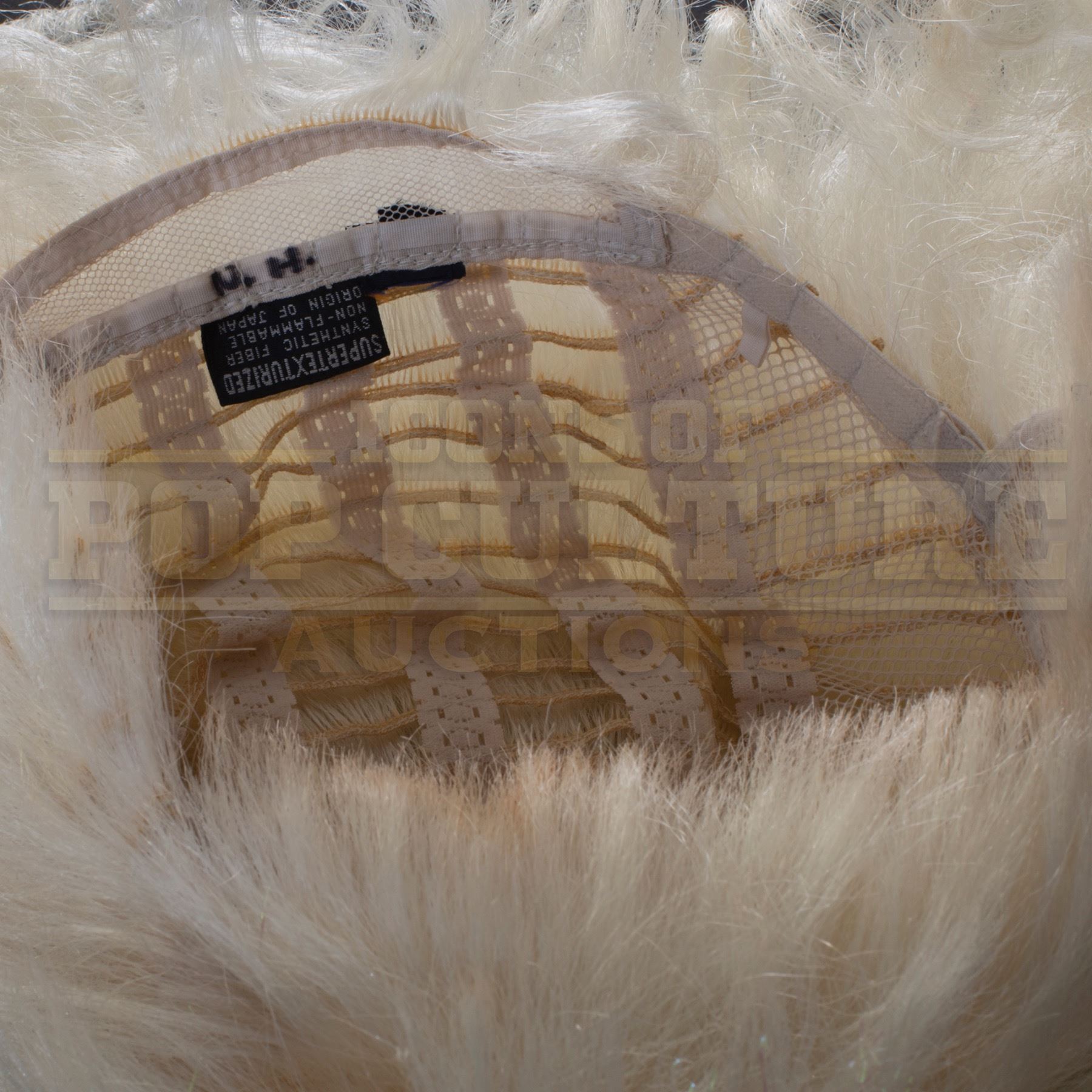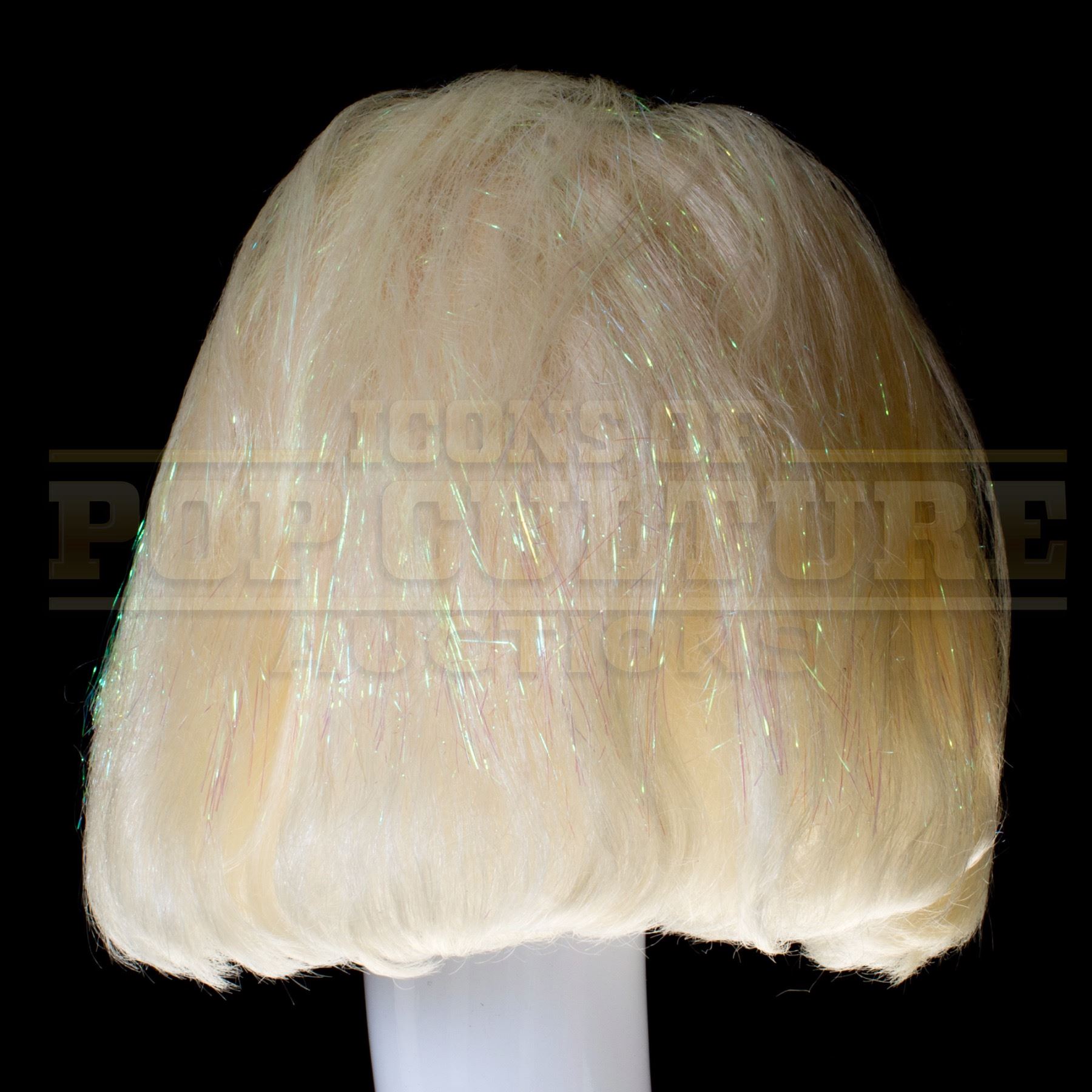 This wig was acquired by the production for use by an uncredited actress as a “Wintertainment Parade Ice Princess”. The white wig features iridescent highlights and is marked “N.H.” on the inside. The wig is seen early in the parade scenes as the Ice Princess float passes the broadcast booth.