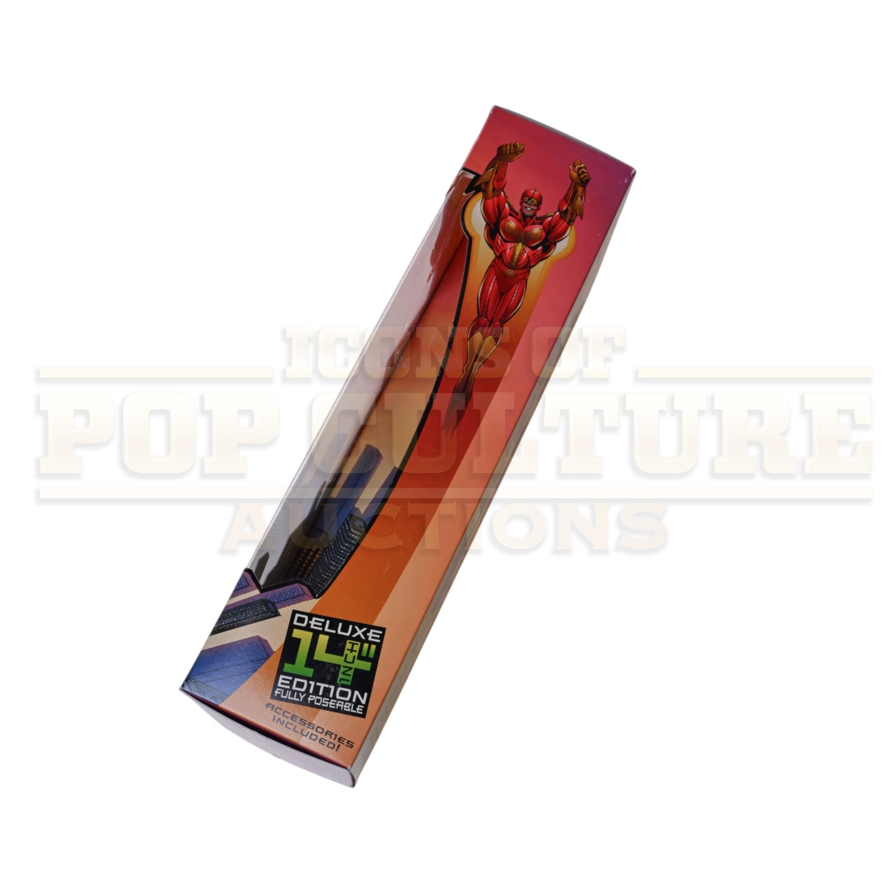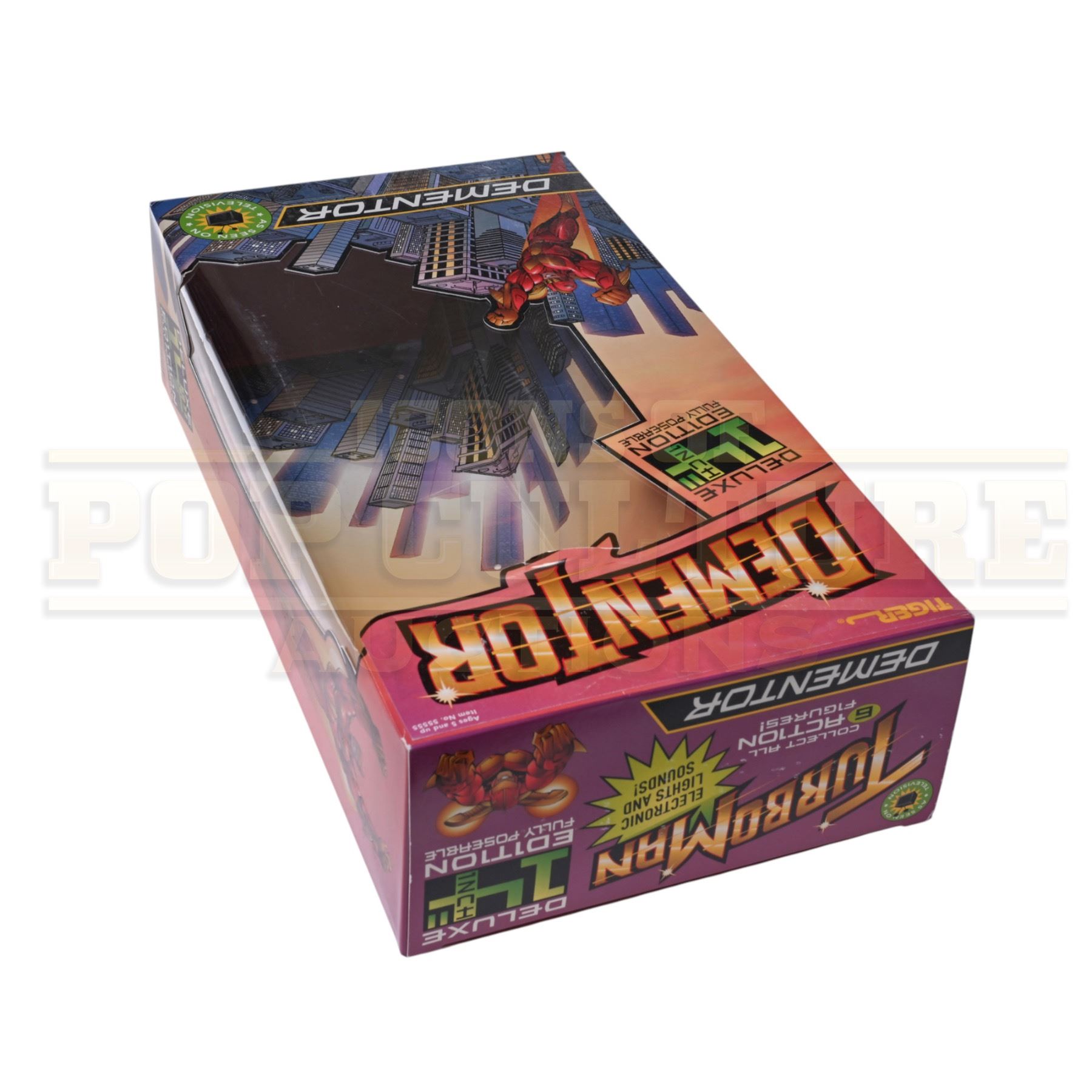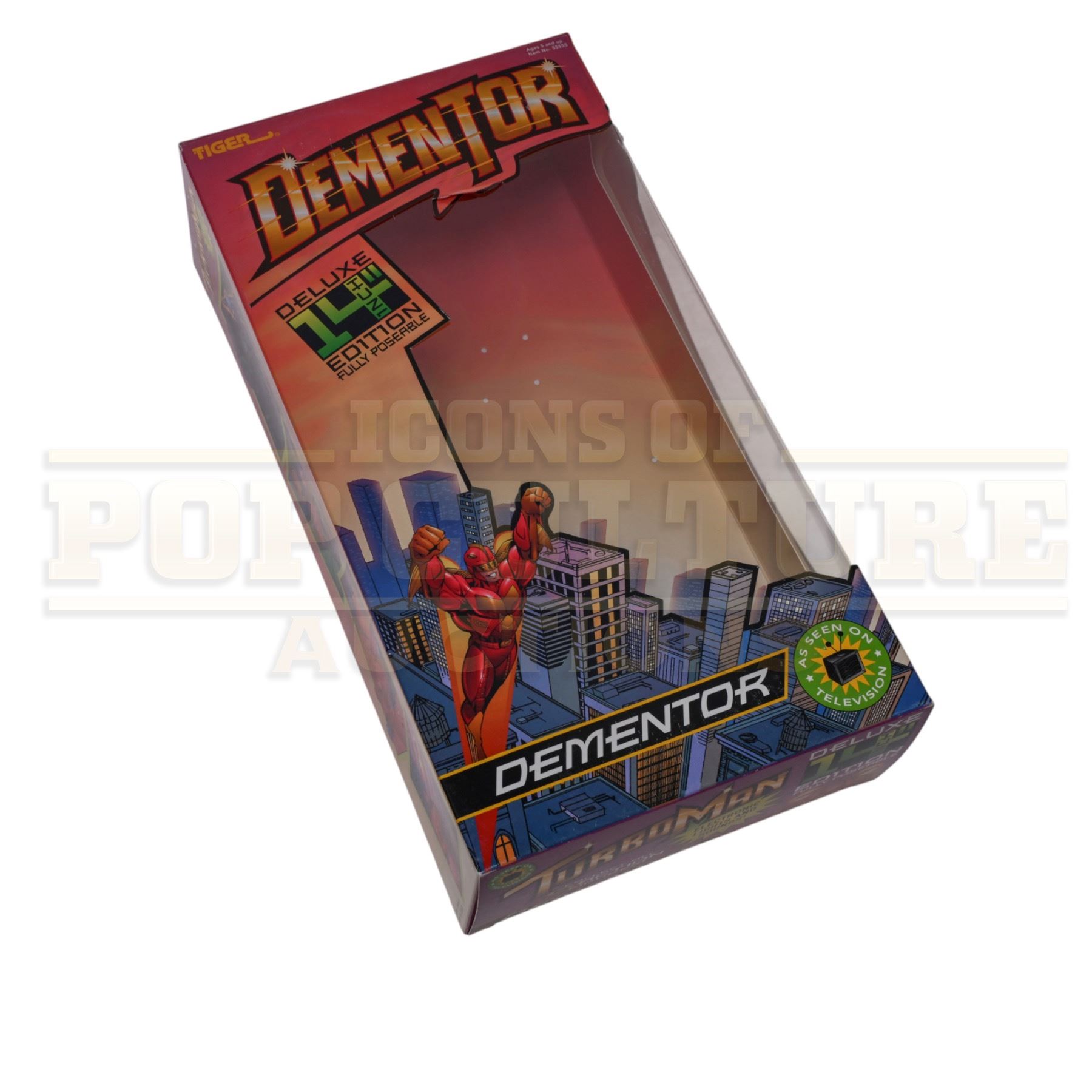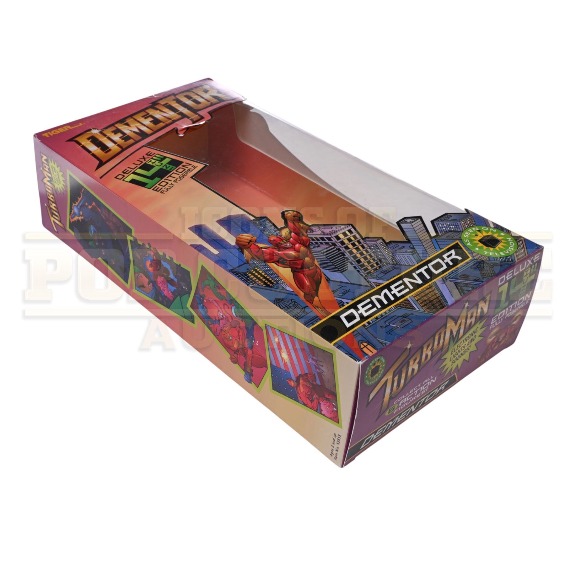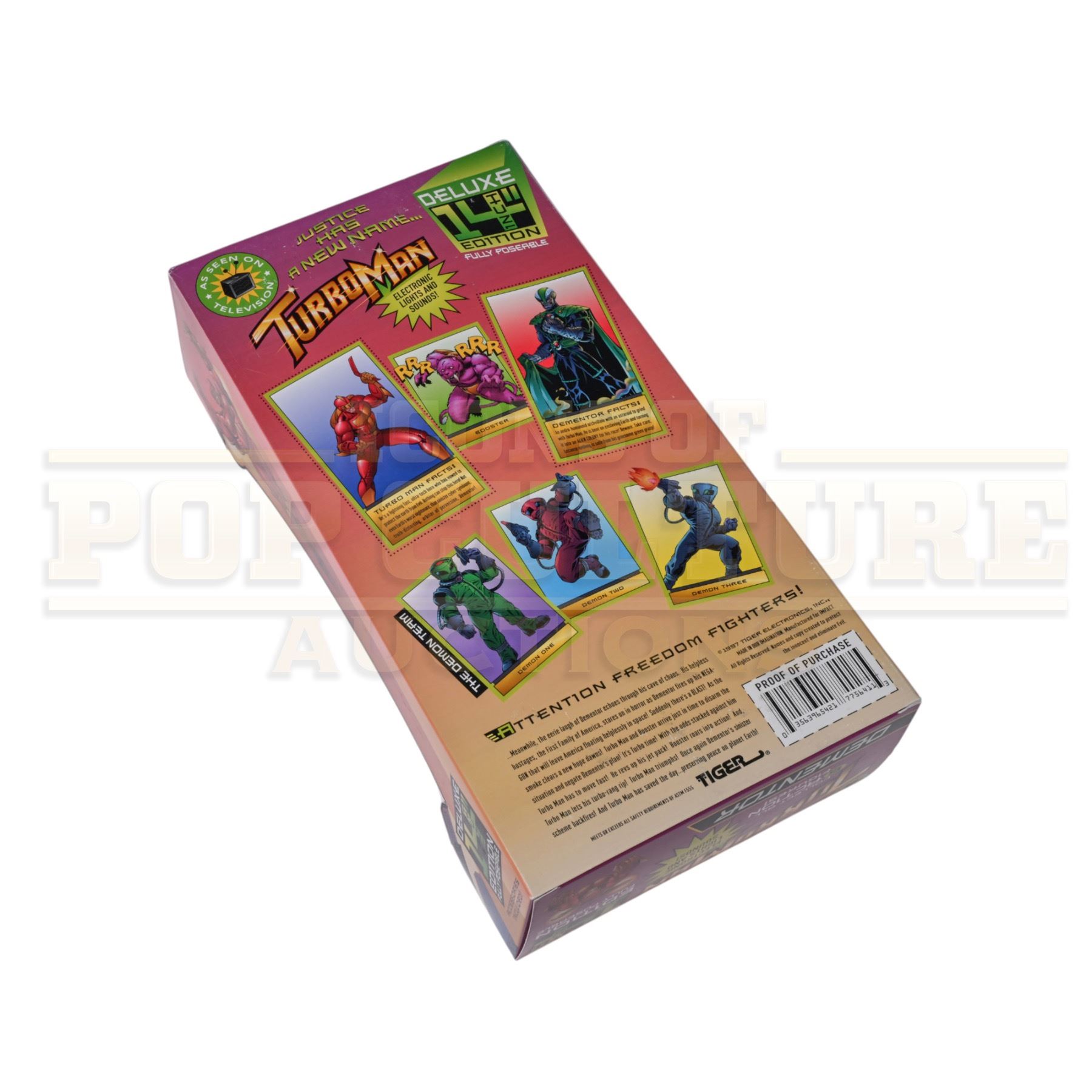 This vibrant prop packaging was designed as part of the fictional “TurboMan” toy line featured throughout the film. The box showcases bold comic-style artwork of Dementor, TurboMan’s villainous rival, with the classic “As Seen on Television” seal and TurboMan Universe character lineup printed on the back. Constructed with a clear plastic window and colorful printed graphics, the box perfectly captures the over-the-top 1990s toy marketing aesthetic that was central to the film’s storyline.