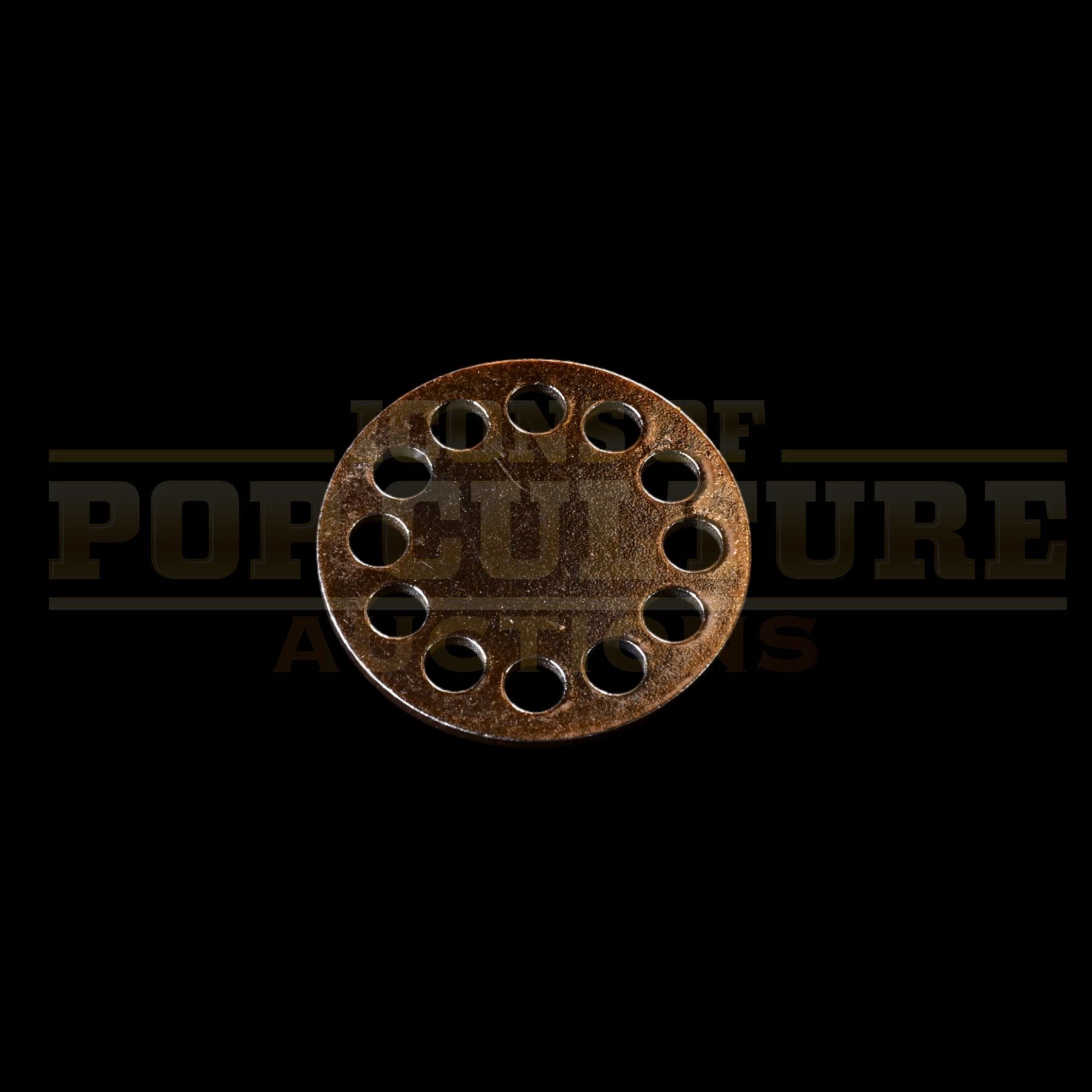 This prop disc was custom-made by the production for use Arnold Schwarzenegger as “Turbo Man”. The plastic disc measures 1.75” in diameter and has a gold color finish. The prop disc is seen as Turbo Man fires them from his wrist disc shooter early in the film on the Turbo Man TV show and again during the parade as Turbo Man (Arnold Schwarzenegger) battles Dementor (Sinbad) and his henchmen.