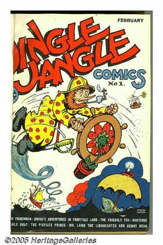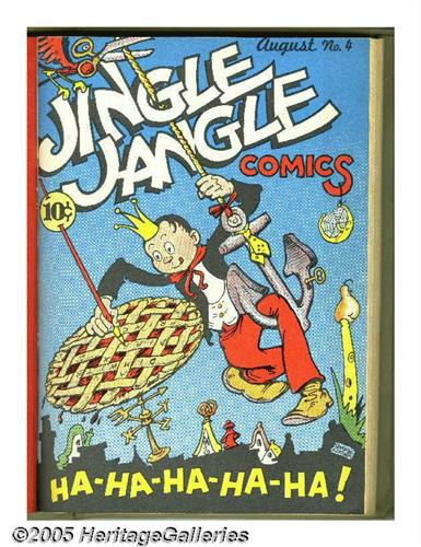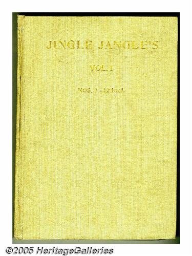 <B>Jingle Jangle Comics #1-12 Bound Volume (Eastern Color, 1943-44).</B></I> These comics were trimmed and bound into one hardcover volume -- they're an Eastern Color publication, but were in the reference library of Western Publishing. The page quality of the comics ranges from off-white to light tan. Approximate Overstreet VG 4.0 value for group = $475. <I>From the Random House Archives</B></I>.