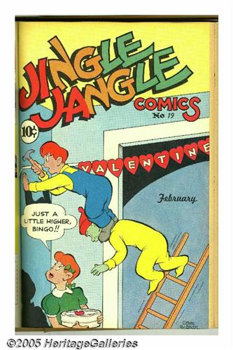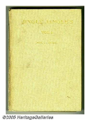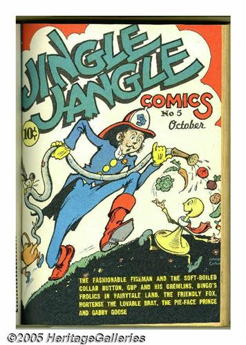 <B>Jingle Jangle Comics #1-24 Bound Volumes (Eastern Color, 1942-46).</B></I> Tucked away among the many bound volumes found in the files of Western Publishing were these two delightful volumes of <B>Jingle Jangle Comics</B></I>, originally published by Eastern Color. This otherwise ordinary comic book designed for younger children happen to contain some of the wackiest stories written and drawn during the 1940s -- "Jingle Jangle Tales" and "The Pie-Faced Prince of Pretzleburg", both creations by the one and only George Carlson. Readers of the landmark book on comics, <B>All in Color For a Dime</B></I> will recall the last chapter in the book, written by none other than Harlan Ellison, titled "Comics of the Absurd", in which the legendary "hard-boiled" writer revealed his soft side in his love of Carlson's work. In fact, <B>The Comics Journal</B></I> recently ran a color section reprinting some of Carlson's crazy comics, the first extensive reprinting ever of this forgotten master's work. Here, in these two magical volumes, you get the real thing -- in all but a few issues, Carlson contributes two zany stories. These two volumes contain file copies of comics that were bound and trimmed into hardback books designed for office use. Many of the comics still look new, with glossy colors and clean pages. Overstreet 2005 VG 4.0 value for group = $714. <B>From the Random House Archives.</B></I>