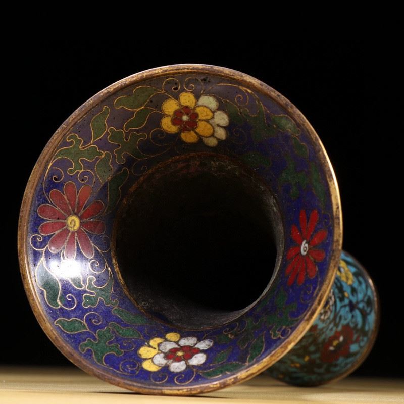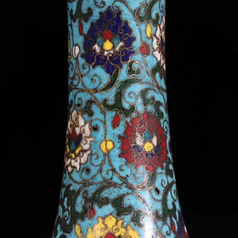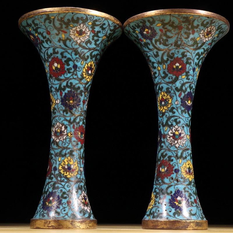This pair of Jingtai blue cloisonné vases features exquisite flower-patterned designs, showcasing the unique charm of traditional cloisonné craftsmanship. The floral motifs are delicately rendered with vibrant colors, embodying the fine artistry of ancient Chinese craftsmanship. Each flower is carefully designed and inlaid, creating a harmonious visual effect, making them ideal for collection or decoration.