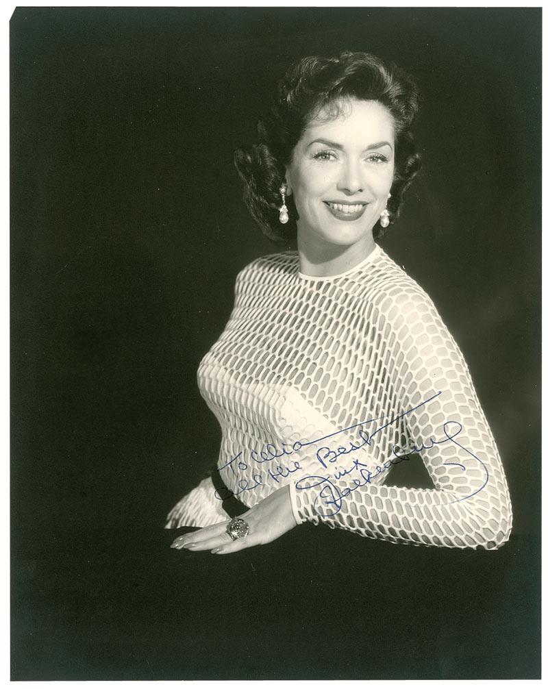 Vintage matte-finish 7.5 x 9.5 publicity photo, signed and inscribed in ballpoint “To Celia, all the best, Jinx Falkenburg.” In fine condition, with some silvering to the darker areas, a clipped upper left corner, and trimmed edges.